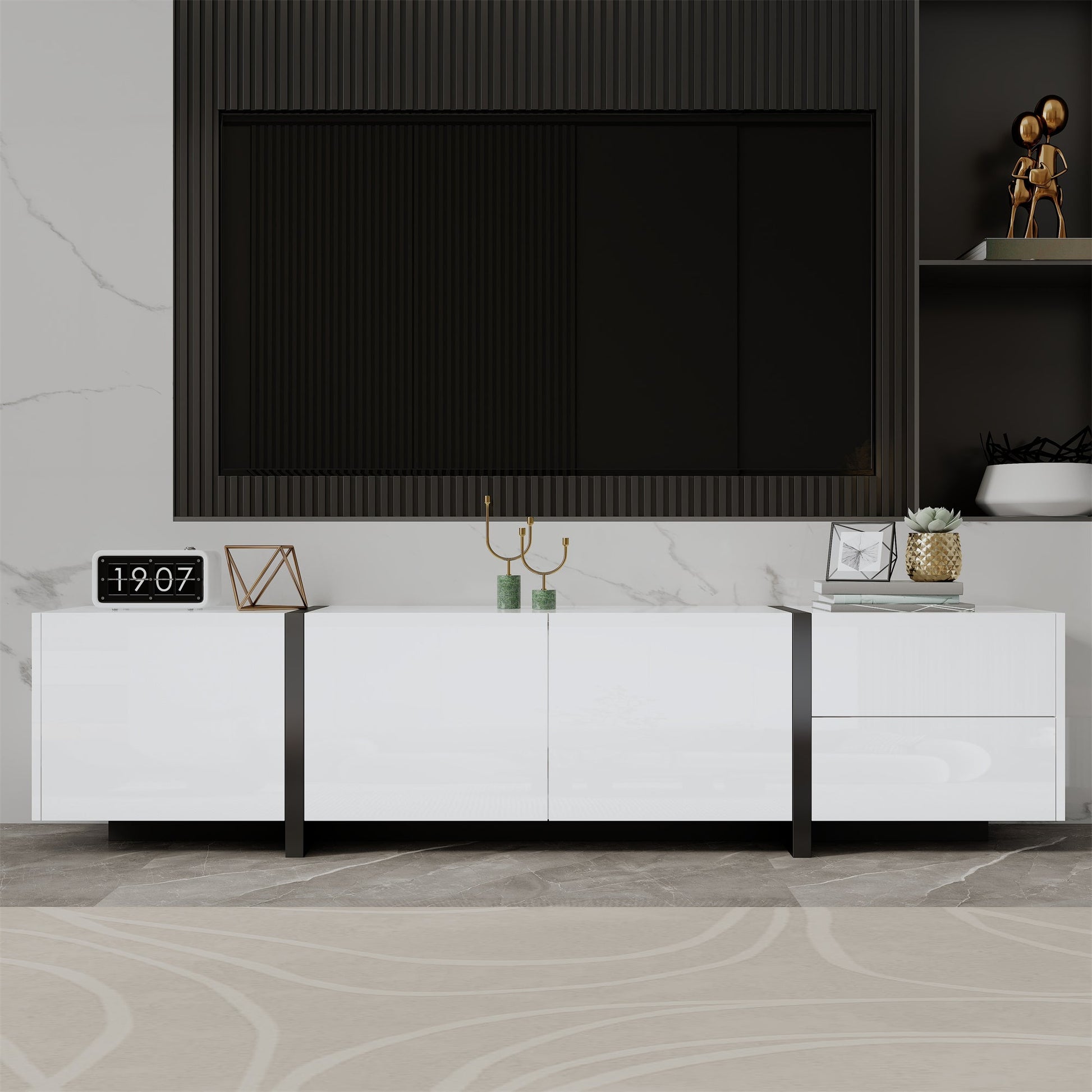 TV Cabinet: White High-Gloss with Black Legs and Simple Doors/Drawers