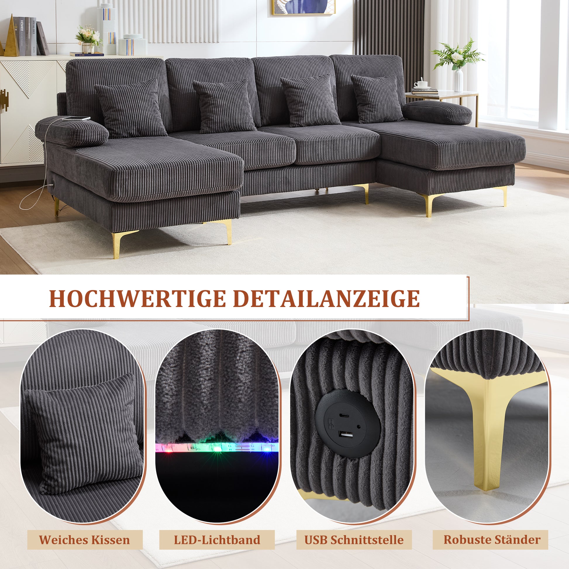 U-Shaped Sofa, LED Ambient Lighting & USB-C Port, Solid Wood Frame, Grey
