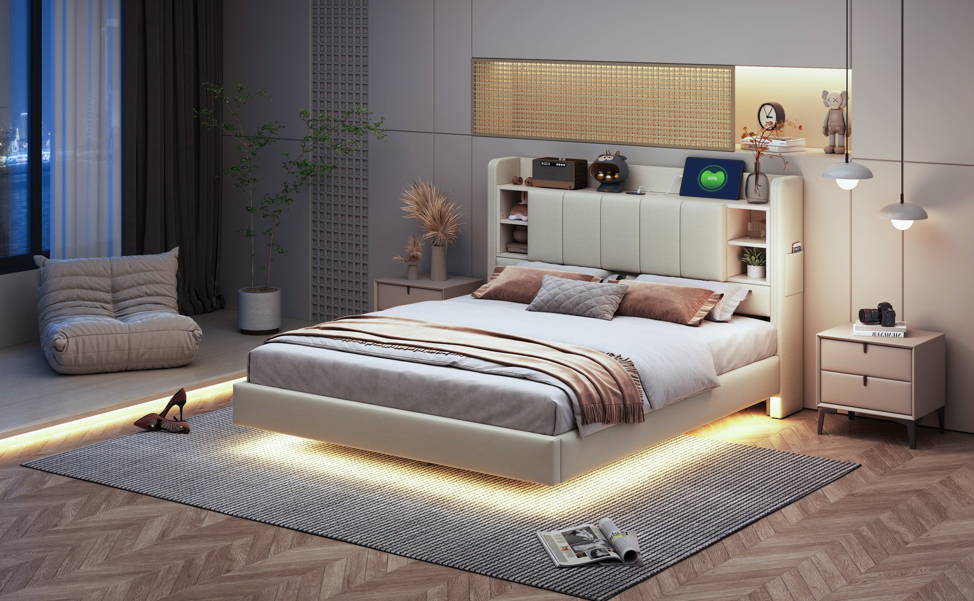 Upholstered Bed 140 x 200 cm, USB, Light Strip, Reversible Headboard, Storage, Metal Frame, Linen Fabric, Beige