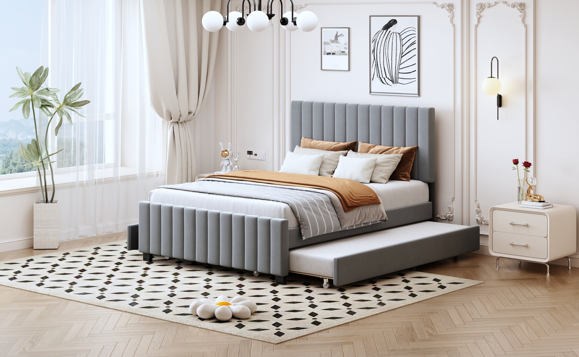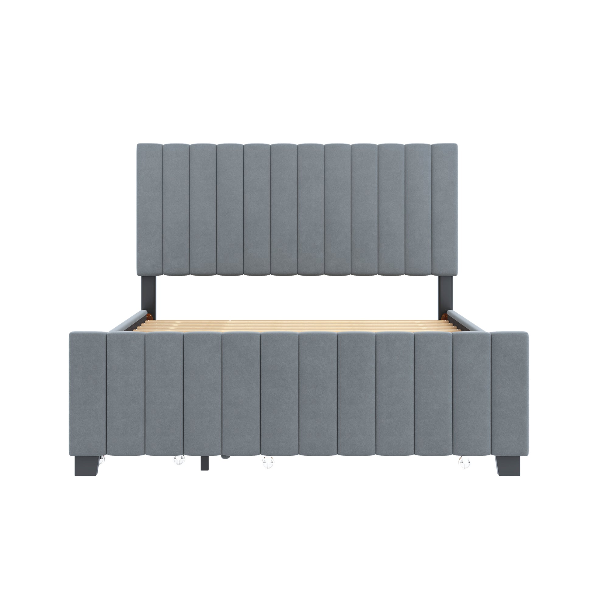 Upholstered Bed 140x190cm, Pull-Out & 2 Drawers, Velvet, Gray