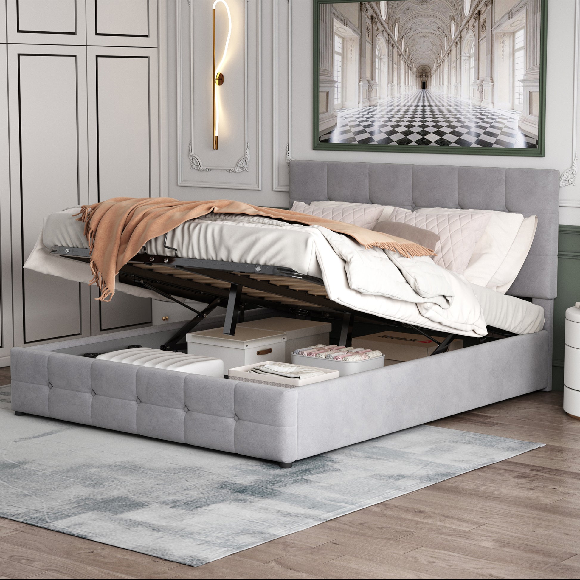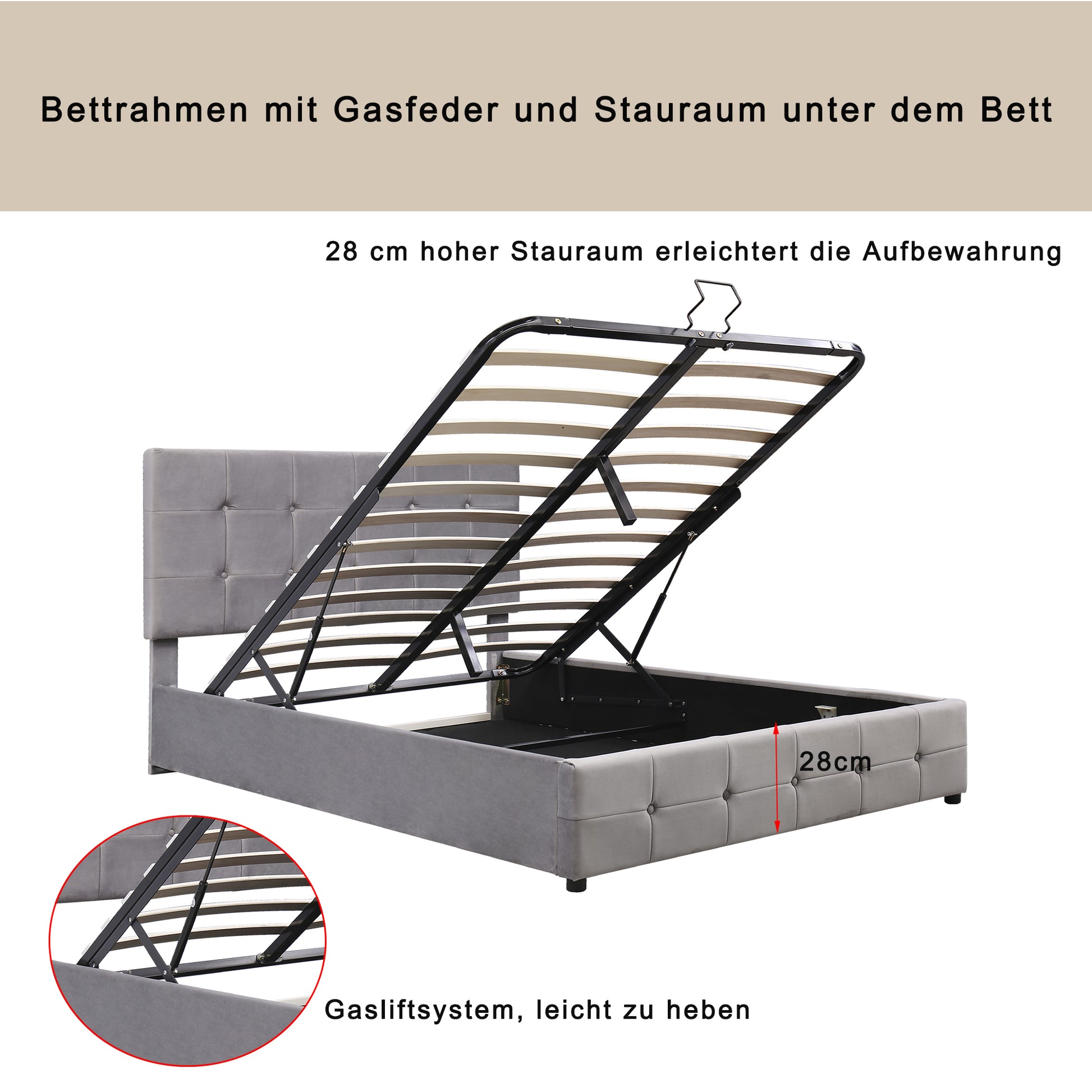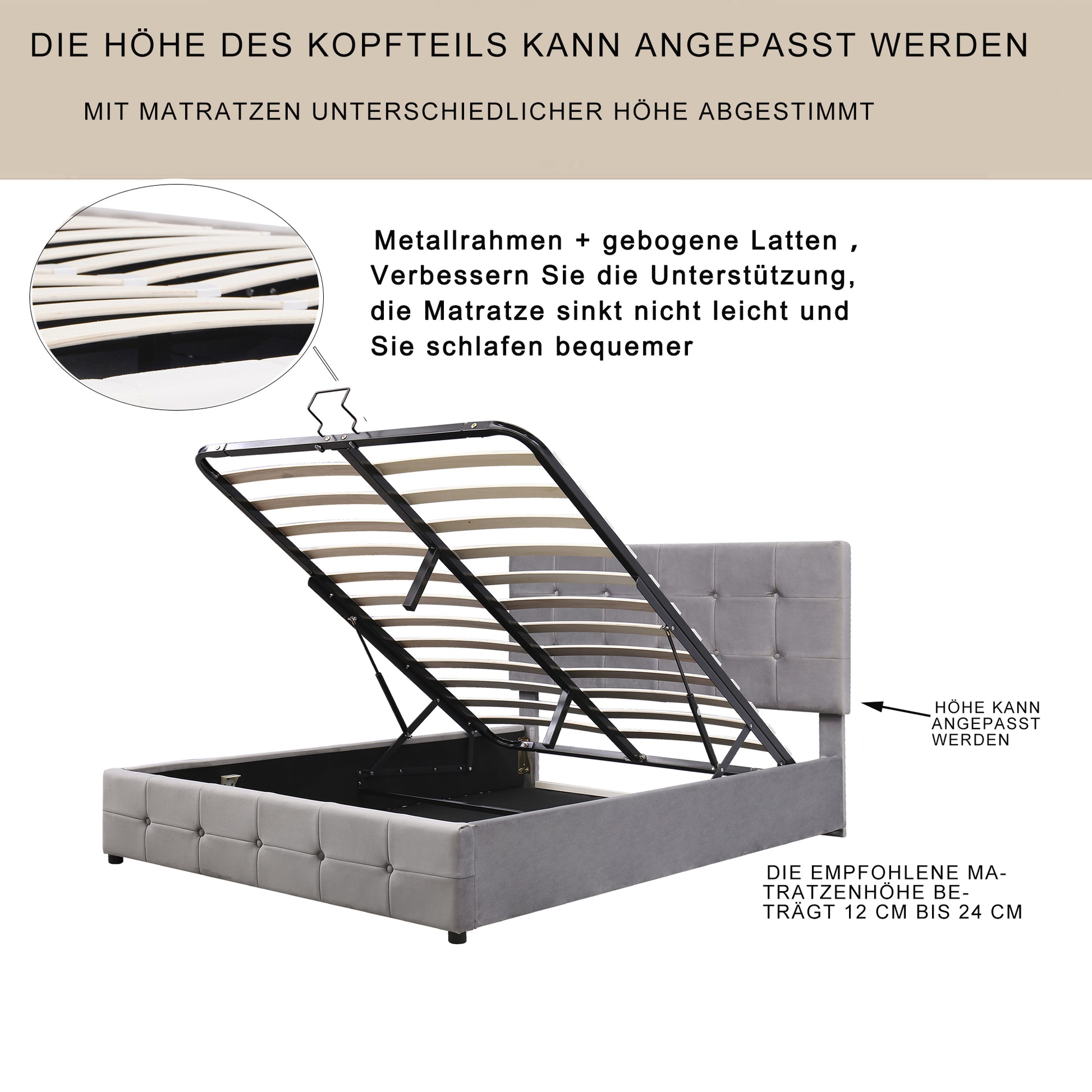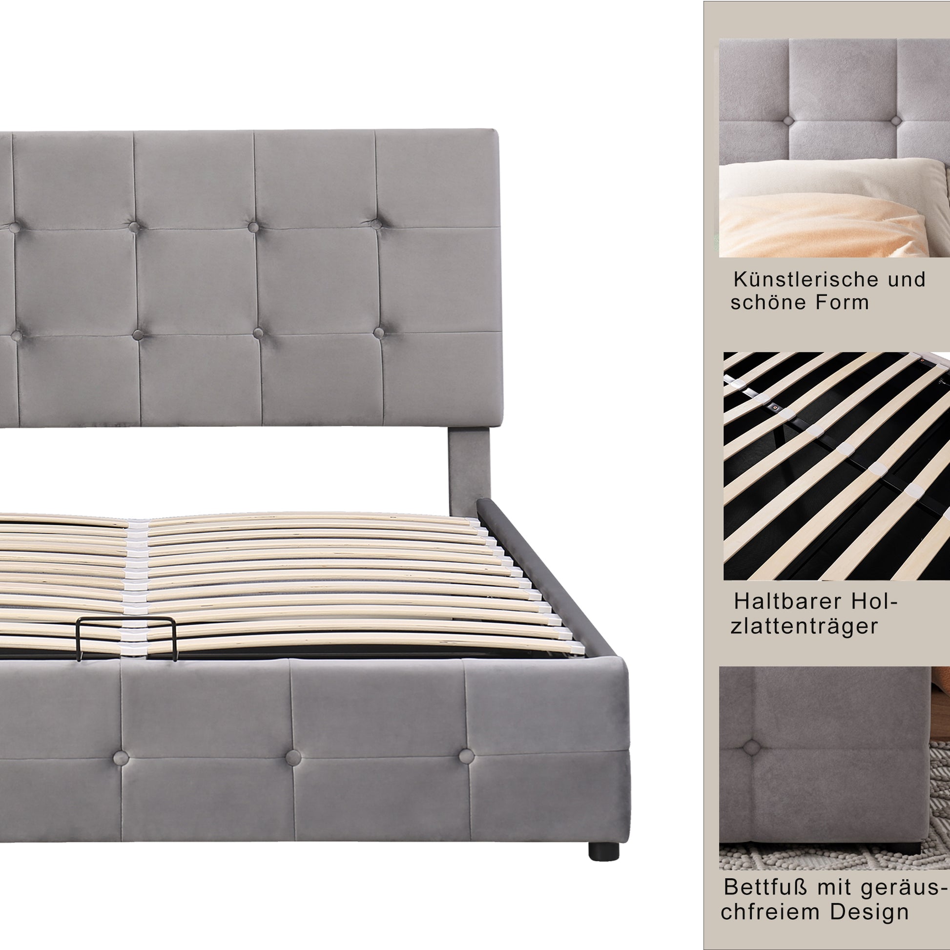 Upholstered Bed, 140x200 Double with Liftable Storage, Adjustable Headboard, Velvet Fabric Gray