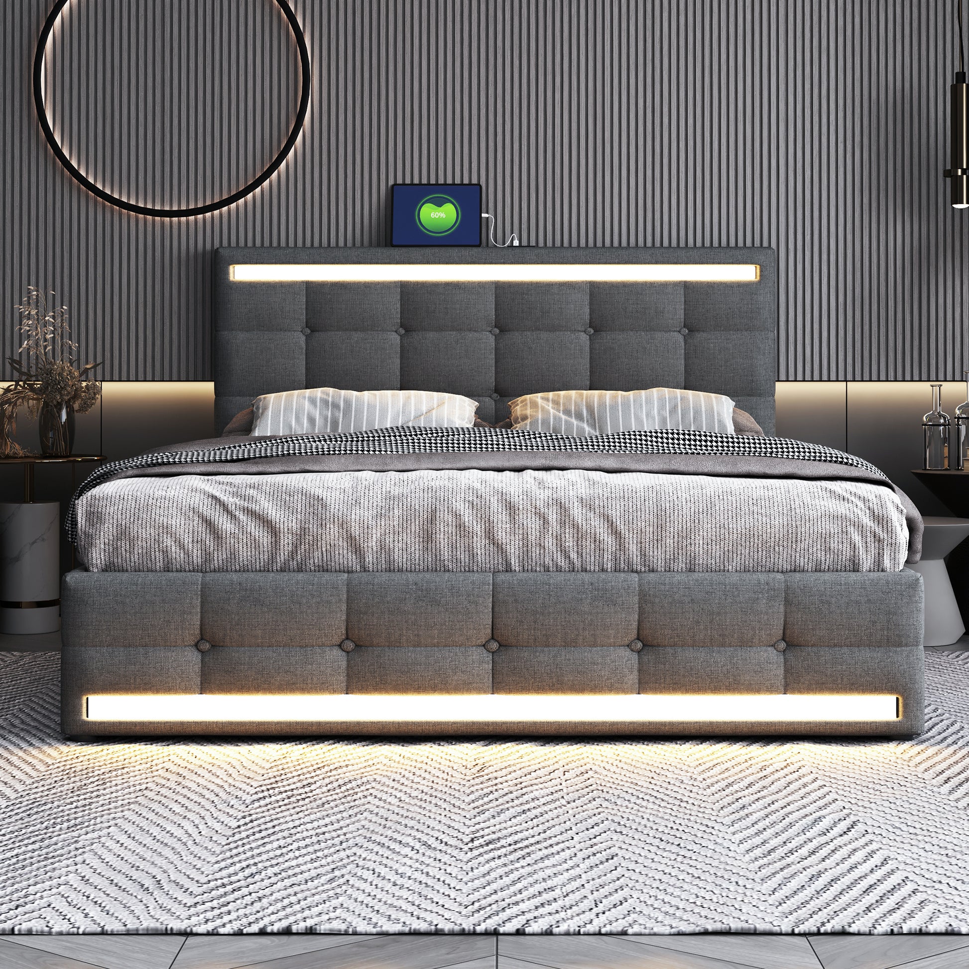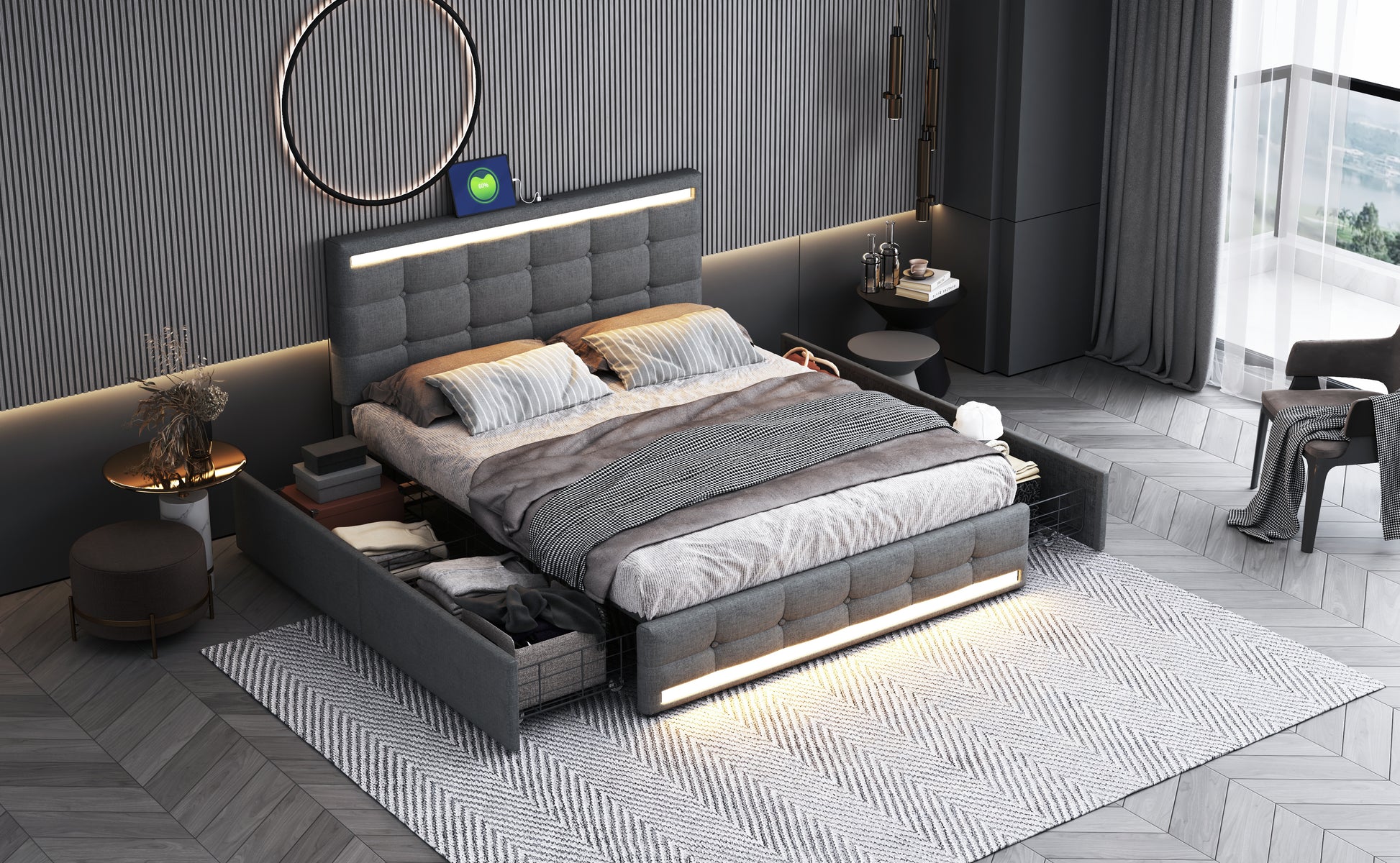 Upholstered Bed 140x200, LED, 4 Drawers, 2 USB Charging Stations, Linen Fabric Gray