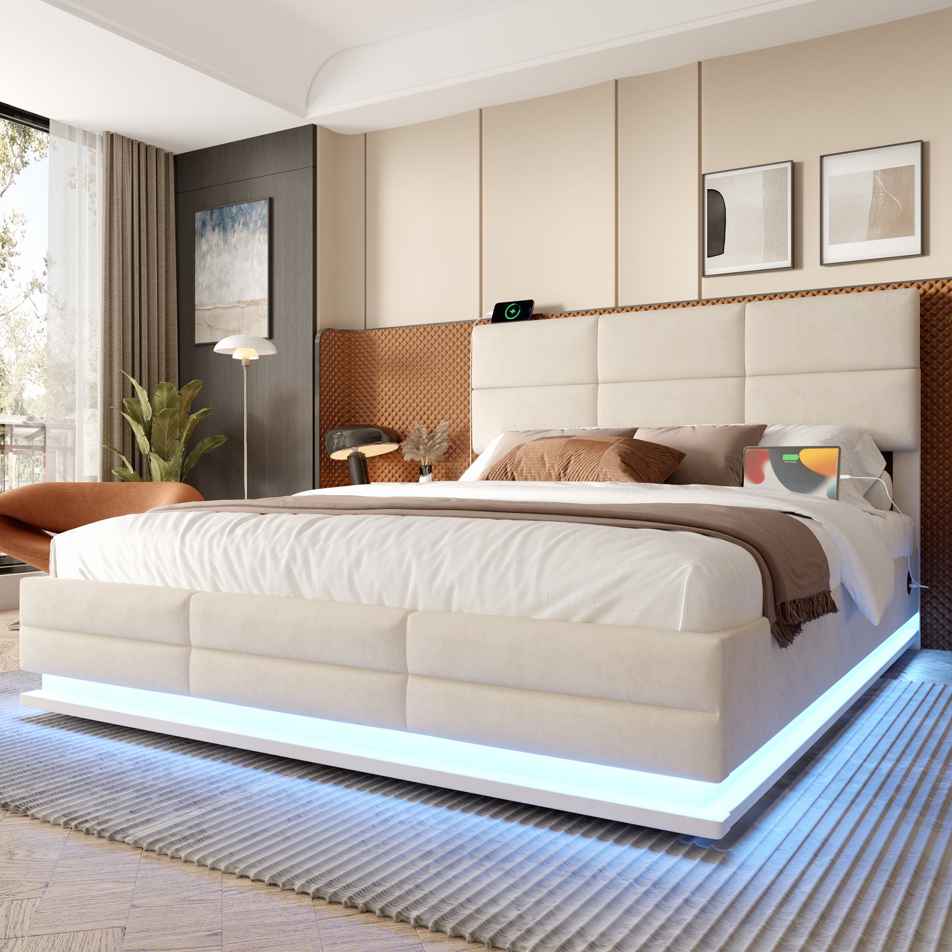 Upholstered Bed, 140x200cm Modern with Adjustable Headboard, USB/Type-C, LED, Hydraulic Lift, XXL Storage - Beige