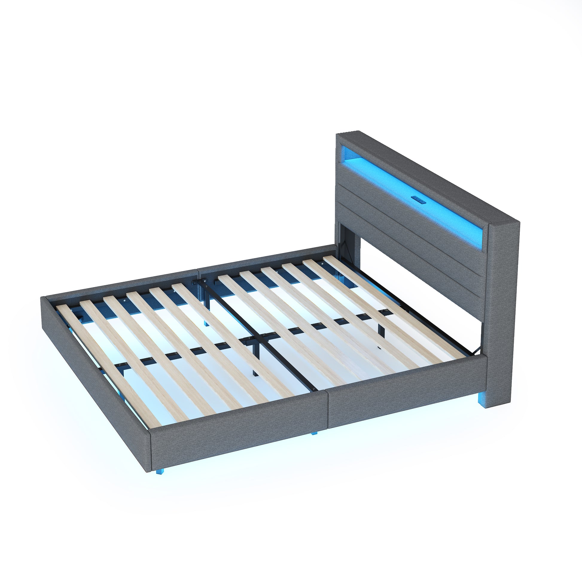 Upholstered Bed 140x200cm, USB & LED, Reversible Headboard, Linen Fabric Grey