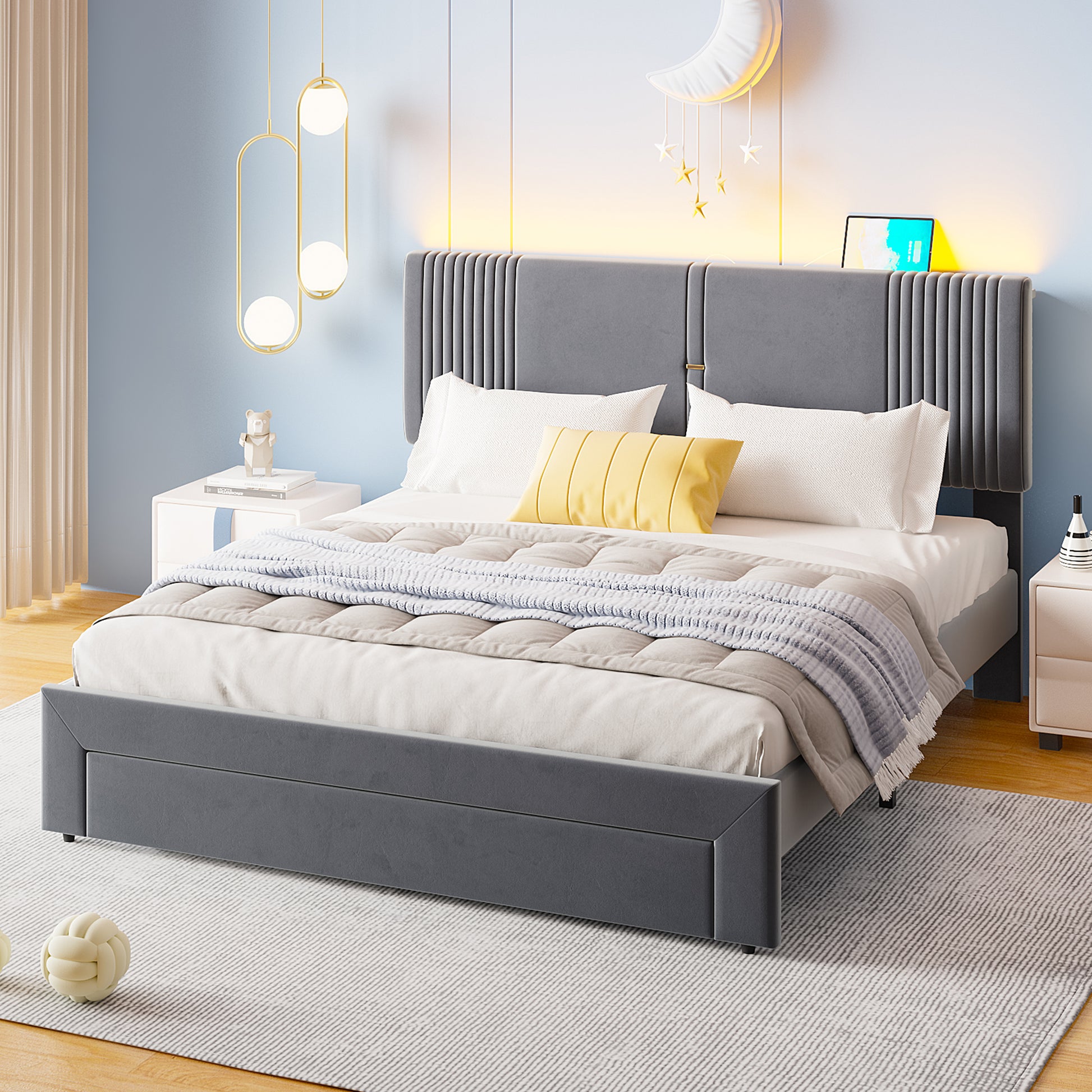 Upholstered Bed, 160x200cm Double with Light Strip, USB Port & Storage Drawer, Grey Velvet