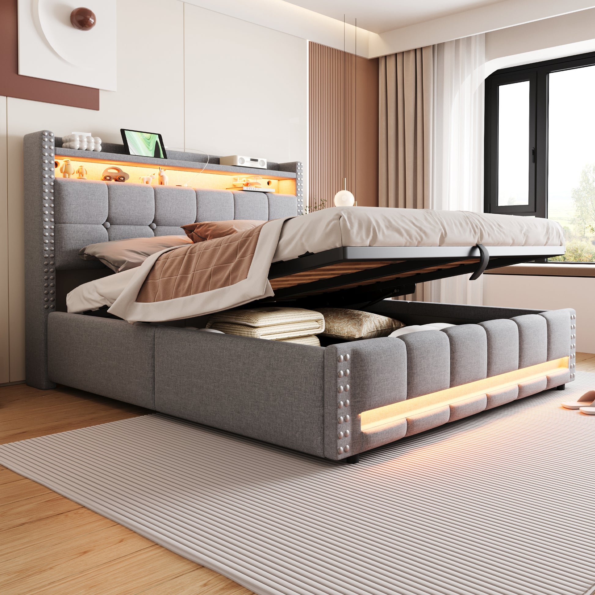 The headboard features built-in shelves and additional storage space, ideal for storing bedside essentials, books, or decorative items. For added convenience, an integrated USB port allows you to charge your devices directly from the bed, ensuring your tech is always powered up. Soft LED lights on the headboard provide gentle illumination, creating a cozy ambiance perfect for a restful night's sleep. The hydraulic lifting system offers a discreet solution for organizing bedding, clothing, and other items. The easy-to-use lifting mechanism allows quick access to hidden storage compartments, keeping your room tidy.