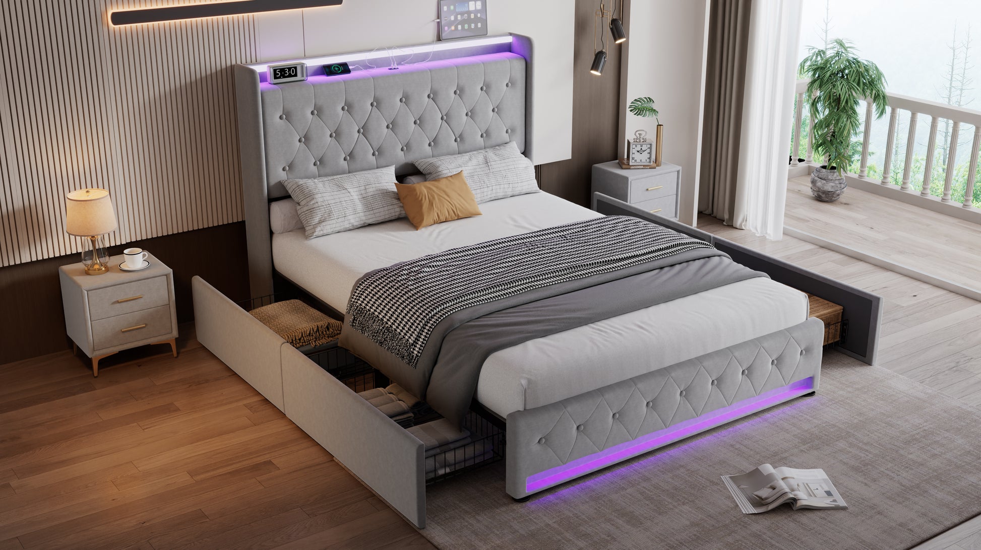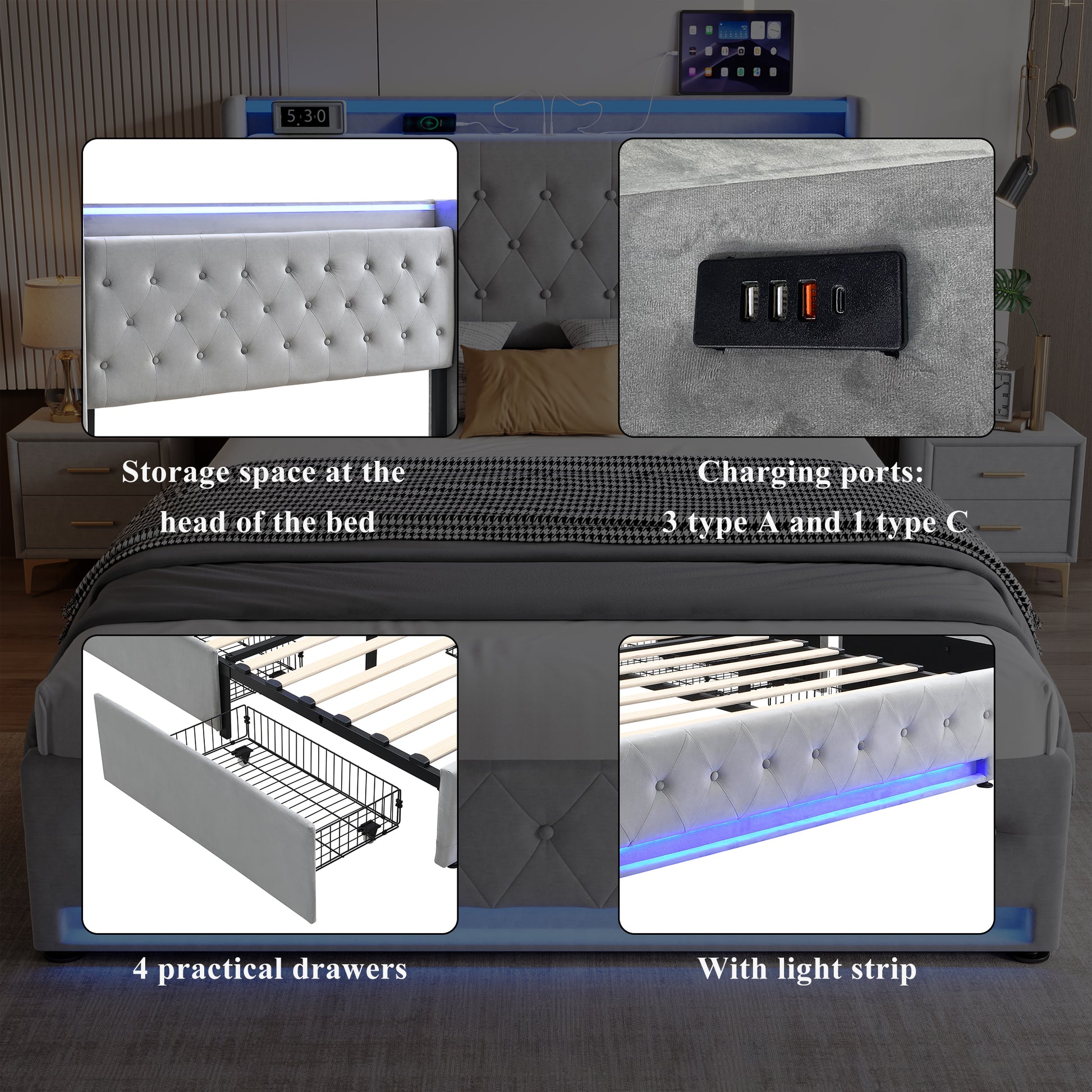 Upholstered Bed, 4ft6 Double with 4 Drawers, Light Strips & Charging Socket, Grey Velvet