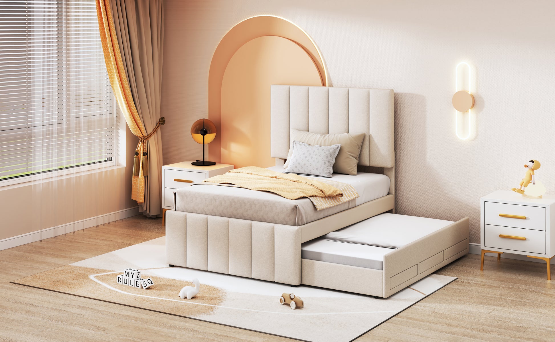 Upholstered Bed 90x200cm, Trundle & Storage, Linen Beige