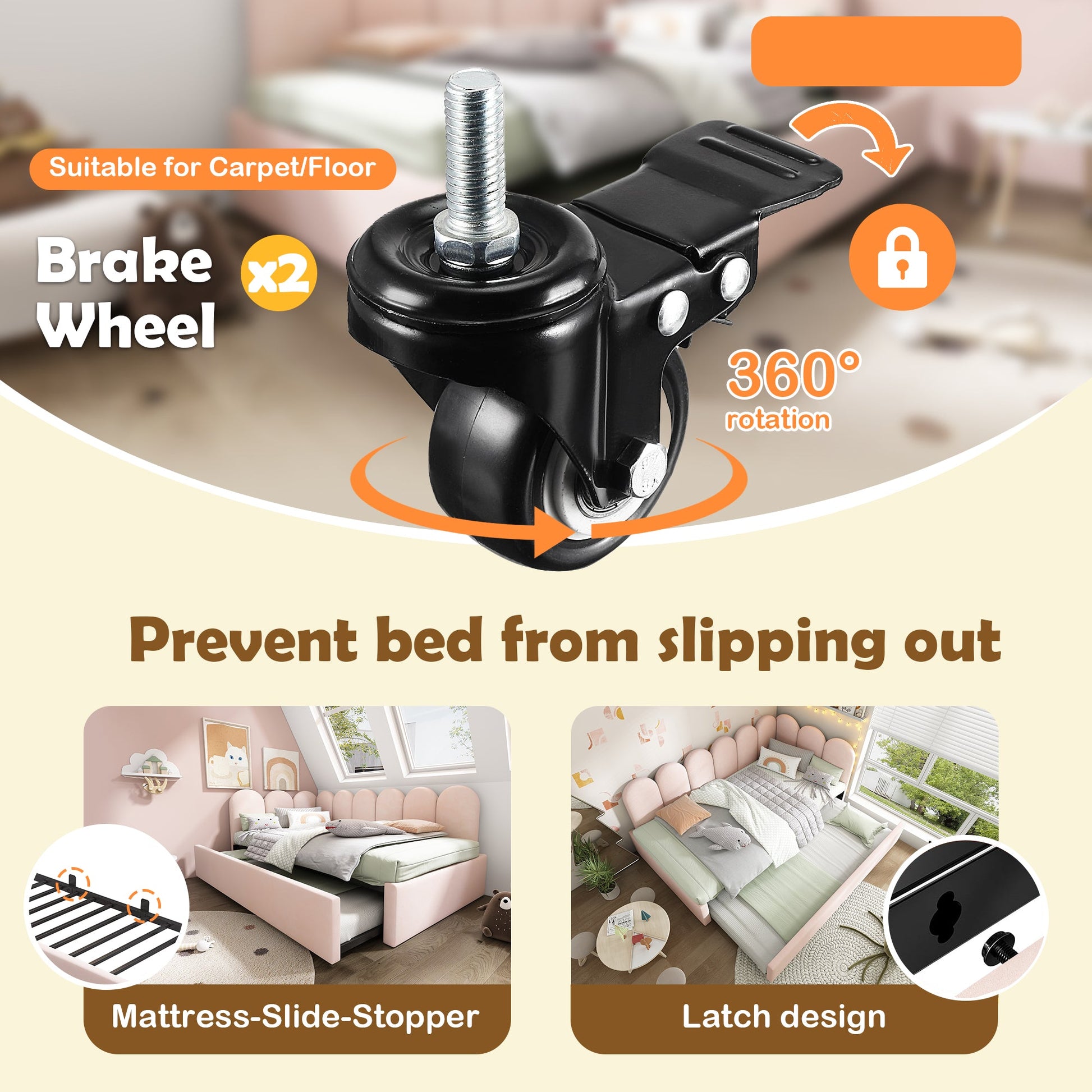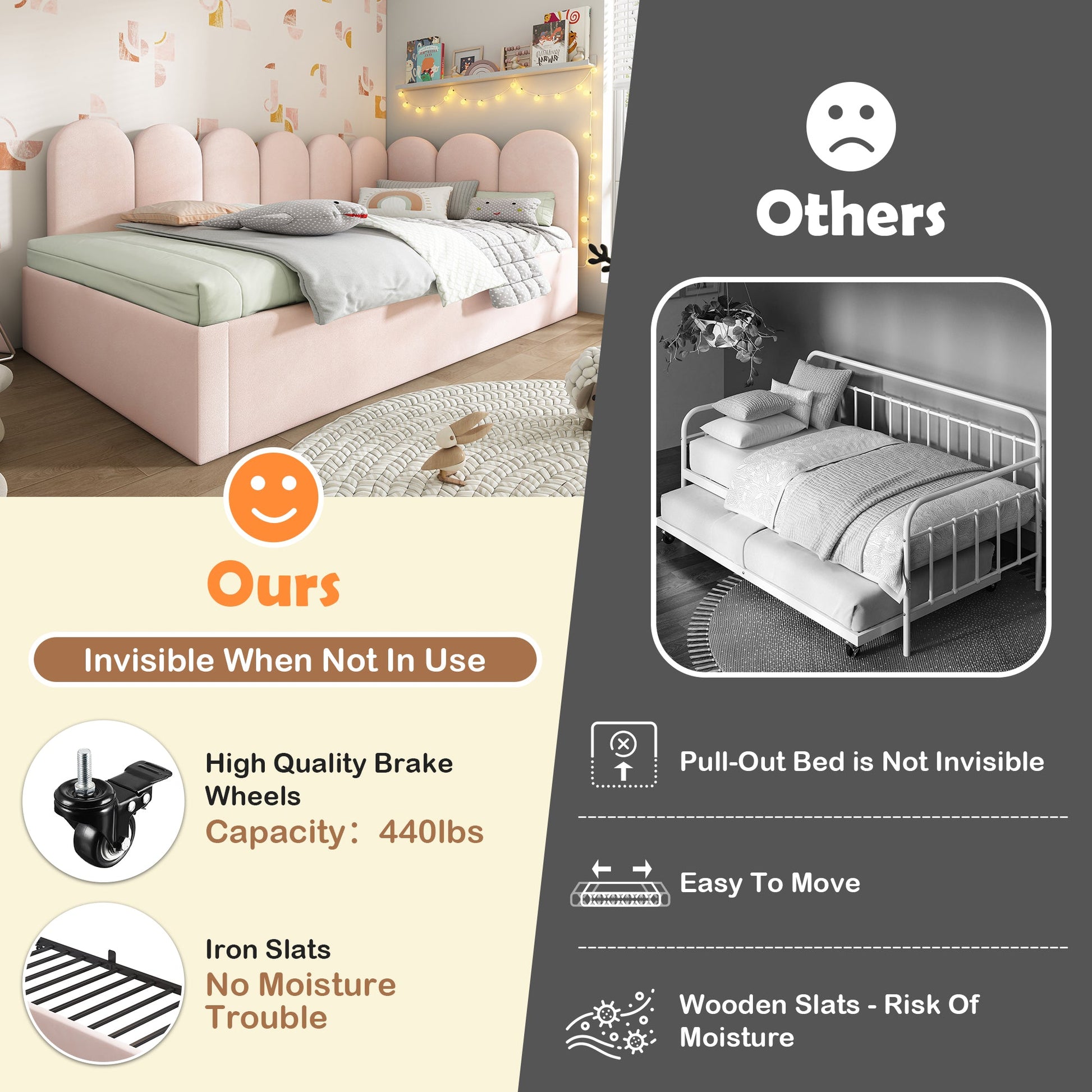 Made with soft, skin-friendly velvet and a thick foam backrest, this bed offers comfort whether lounging or sleeping. The pull-out bed adds extra sleeping space and functionality, featuring casters with brakes and stoppers for safety. Hardware clasps keep the bed secure when not in use, while the slatted frame ensures a solid and restful sleep.