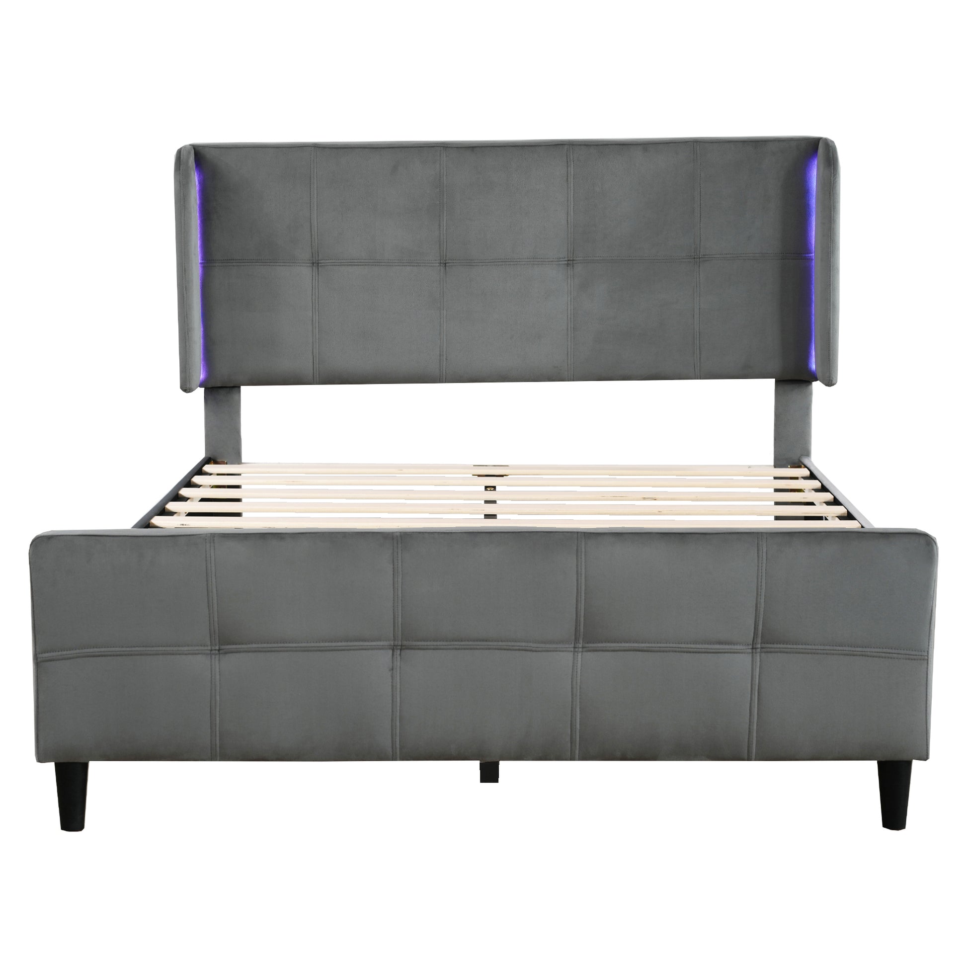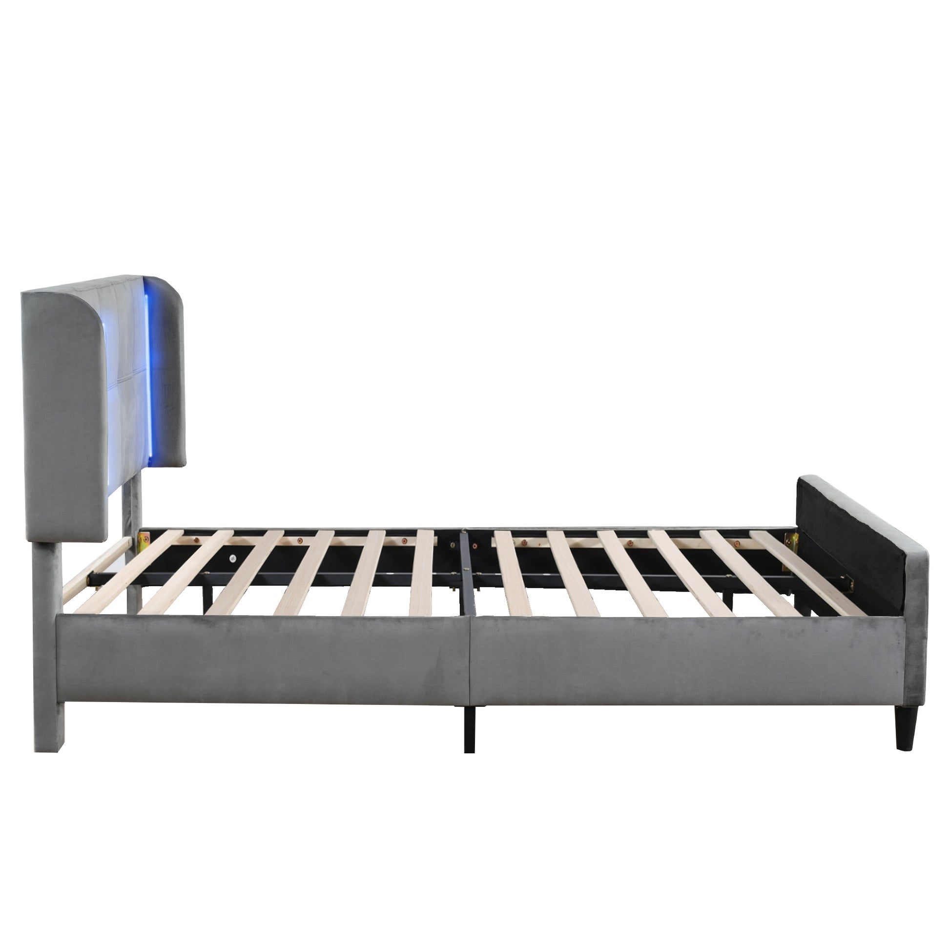 Upholstered Bed, Double with 16-Color LED, Adjustable Headboard, Velvet Gray