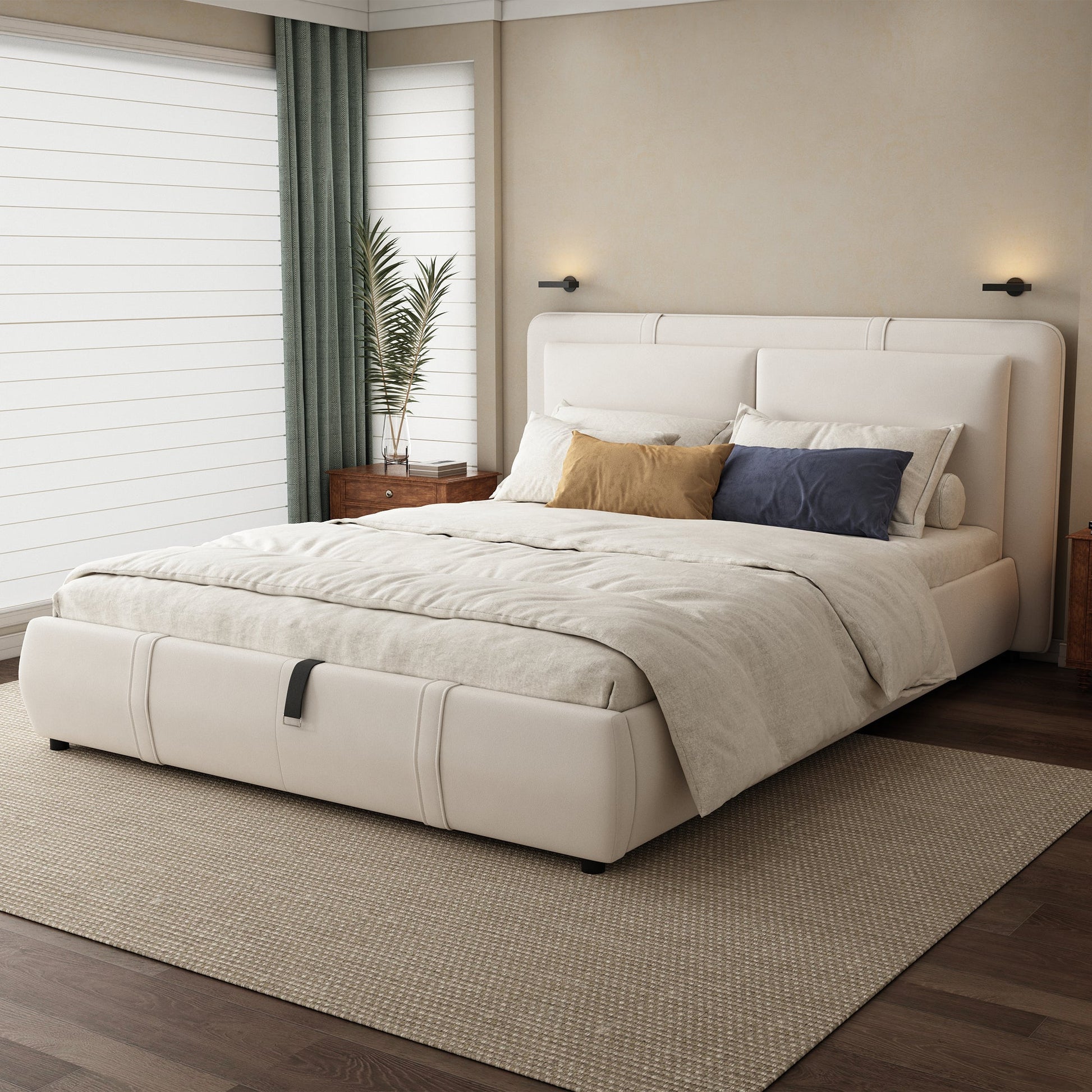 Upholstered Bed, Hydraulic Storage Function, 4ft6 Double 135x190cm, Durable, Sturdy, Removable Soft Headboard Backrest, Velvet Plywood Beige