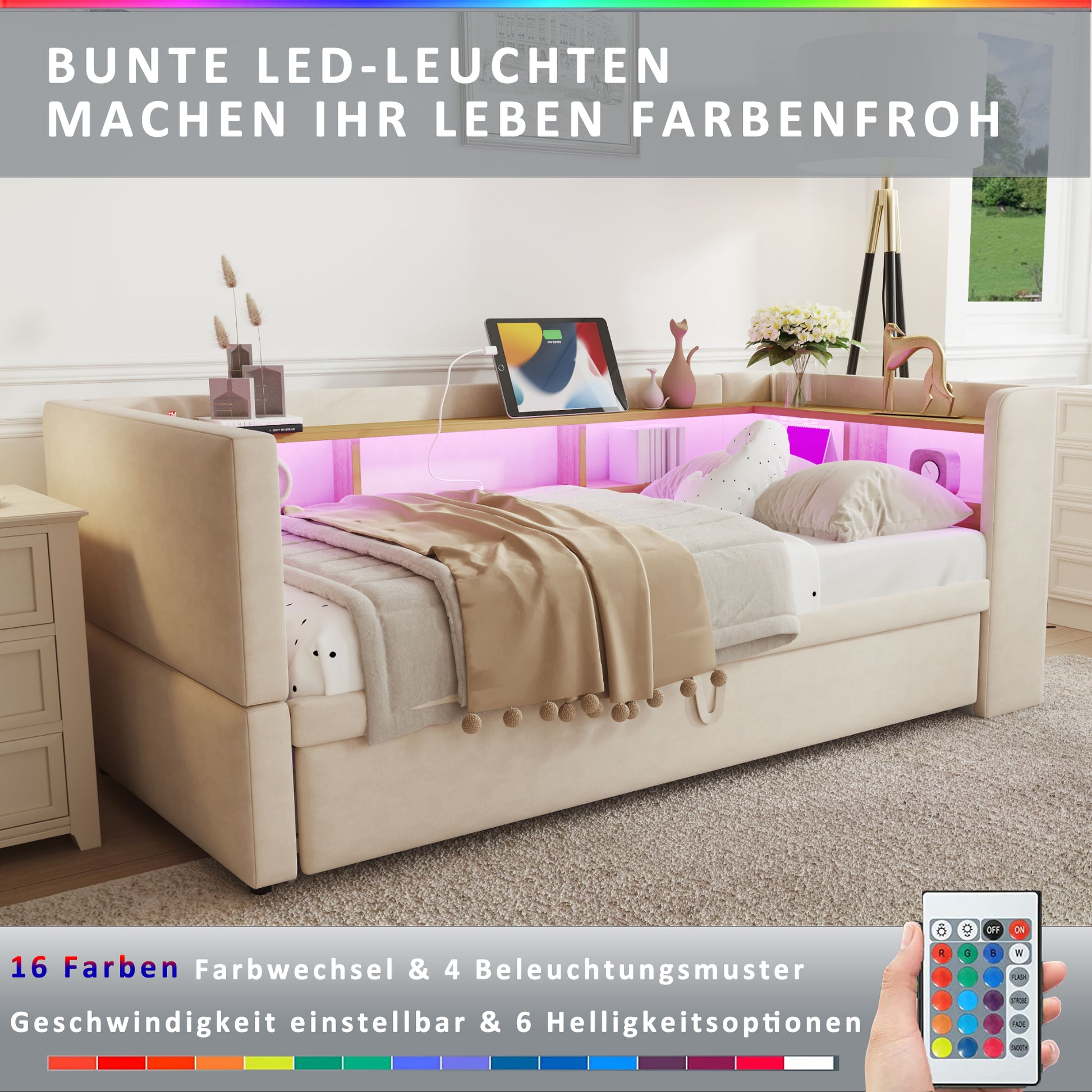 Upholstered Bed, Pull-Out Sofa Bed 90/180*190cm with LED Lights, Sockets & Storage - Beige