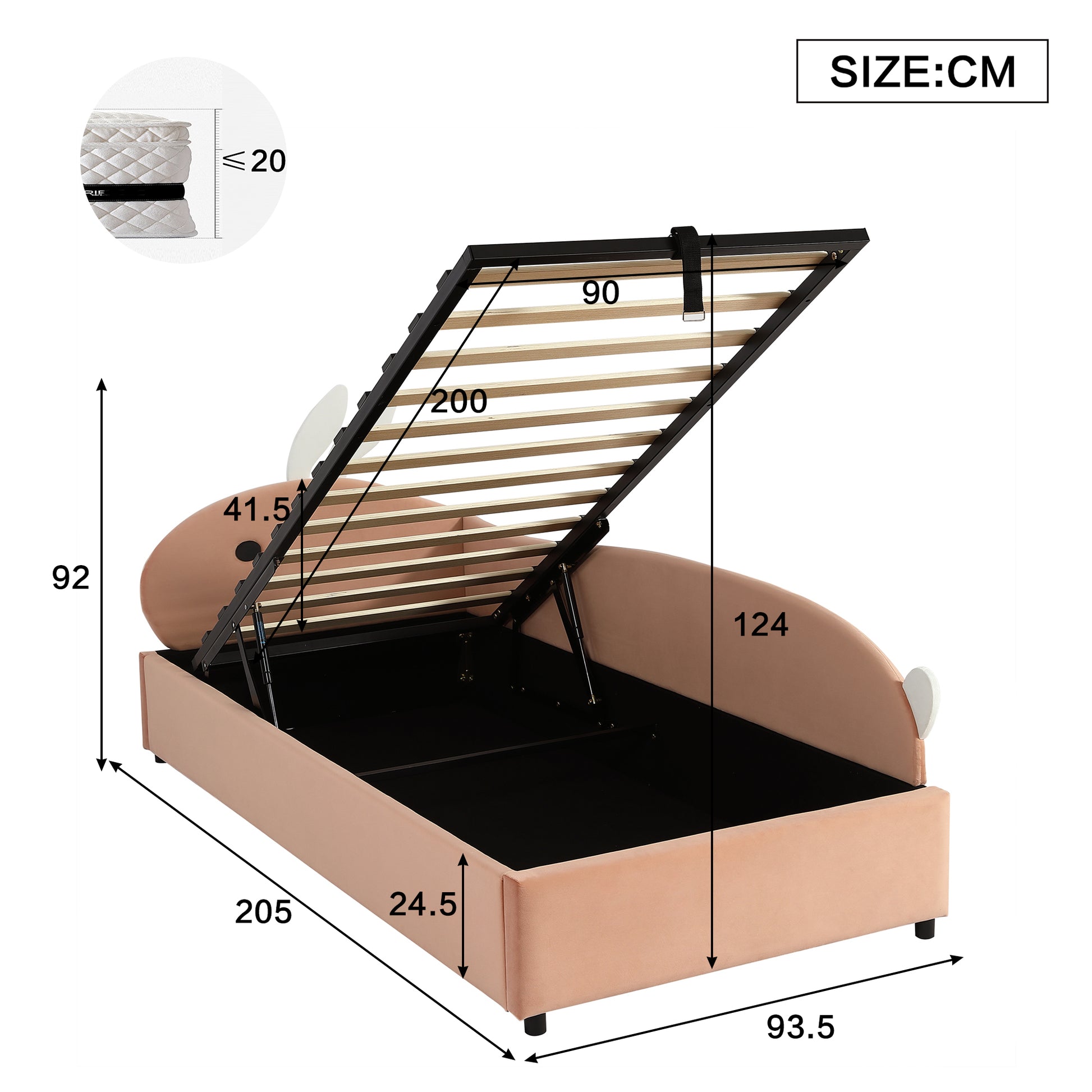 Upholstered Bed, Single Bed, Kids' Bed, Cute Bunny Headboard, Hydraulic Bed with Storage