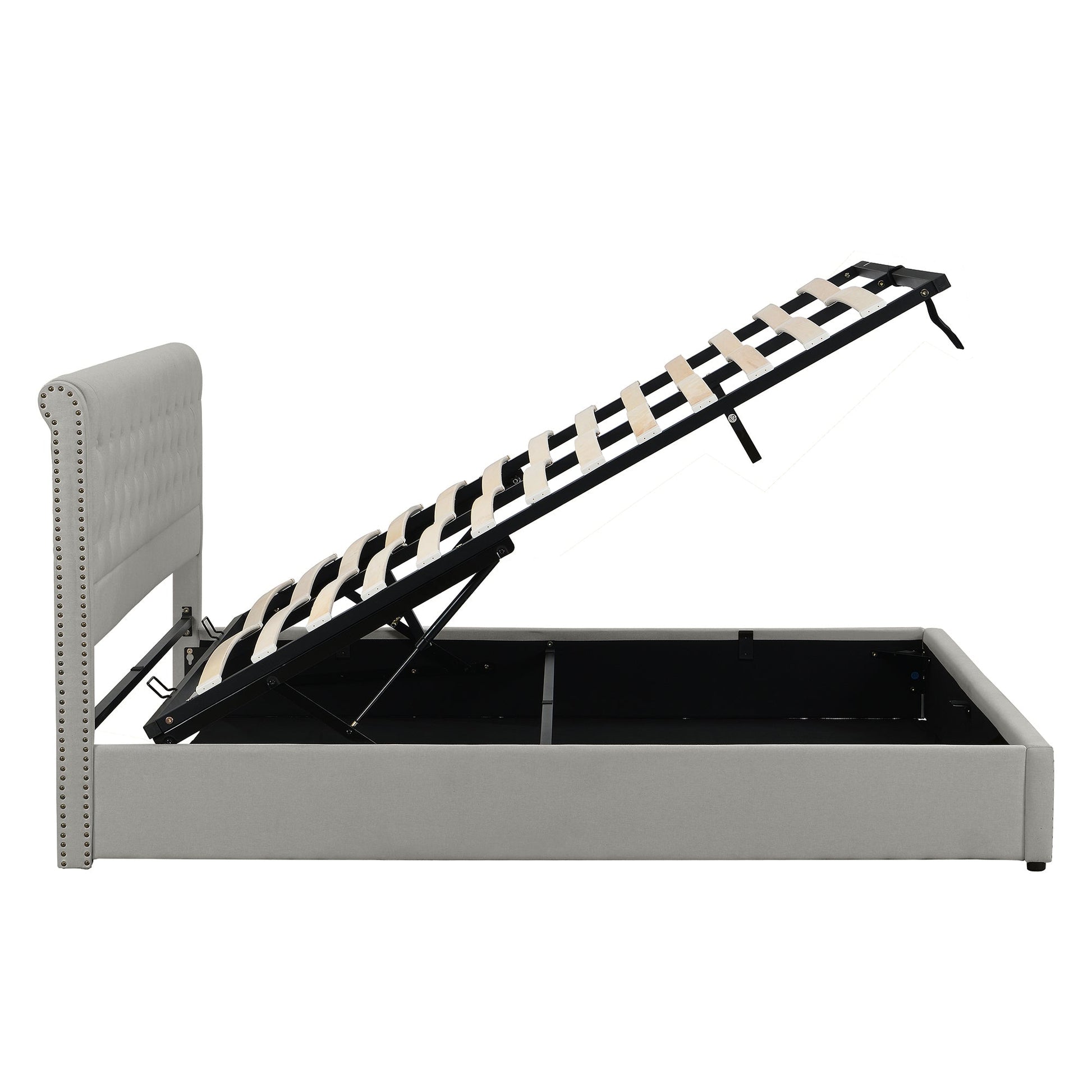 Upholstered Bed, Super King Size 6ft (180x200cm), Hydraulic Storage with Rivet Decoration, Light Grey Linen