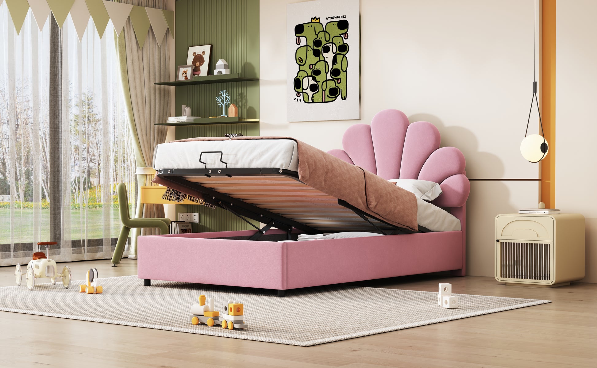 What makes this bed special is not only its attractive floral backrest but also its hidden storage space. This unique headboard, modeled after delicate flower petals, adds a whimsical touch to your room. The upholstered mattress is topped with a soft foam cushion, providing a comfortable backrest for reading or relaxing.