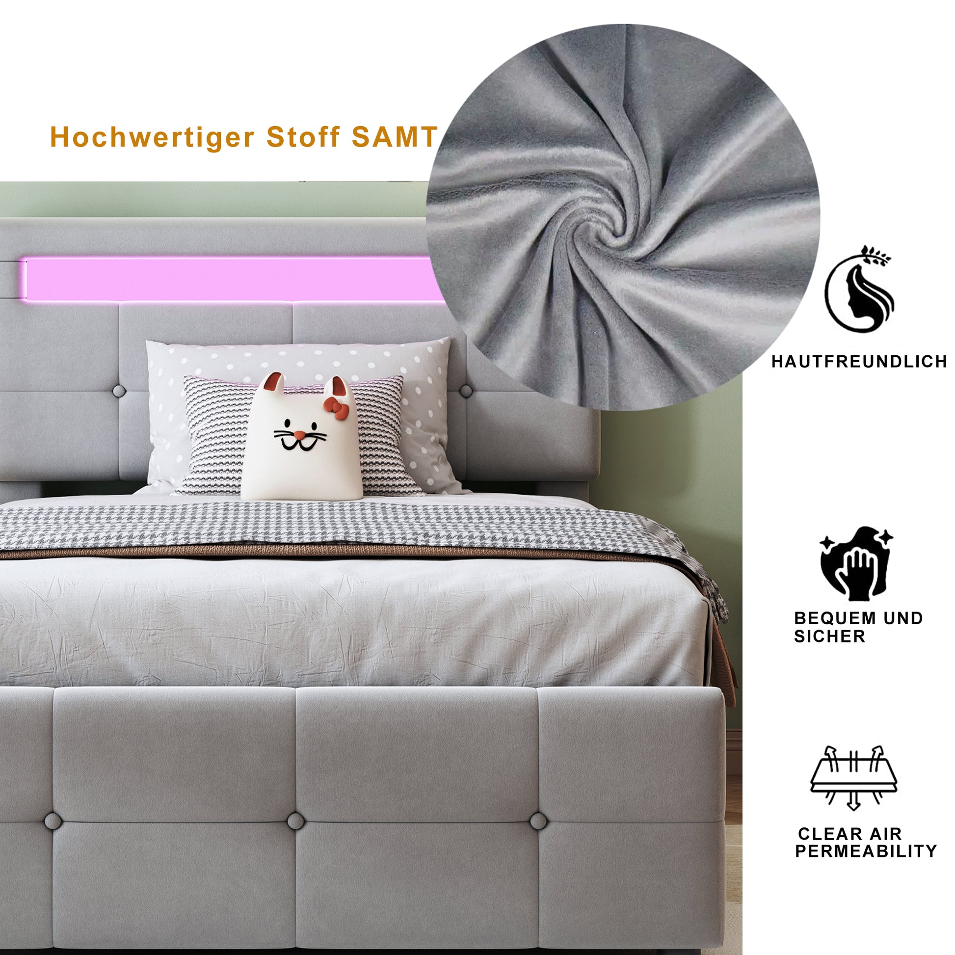 Crafted from a soft, skin-friendly velvet fabric, this upholstered bed provides a cozy and comfortable sleeping environment. The built-in LED lights create a pleasant ambiance in the child's room. The hydraulic storage system offers a practical solution for organizing the room. Simply lift the mattress to access the spacious storage compartment underneath, perfect for storing bedding, toys, and clothes. This innovative design maximizes space without compromising on style.