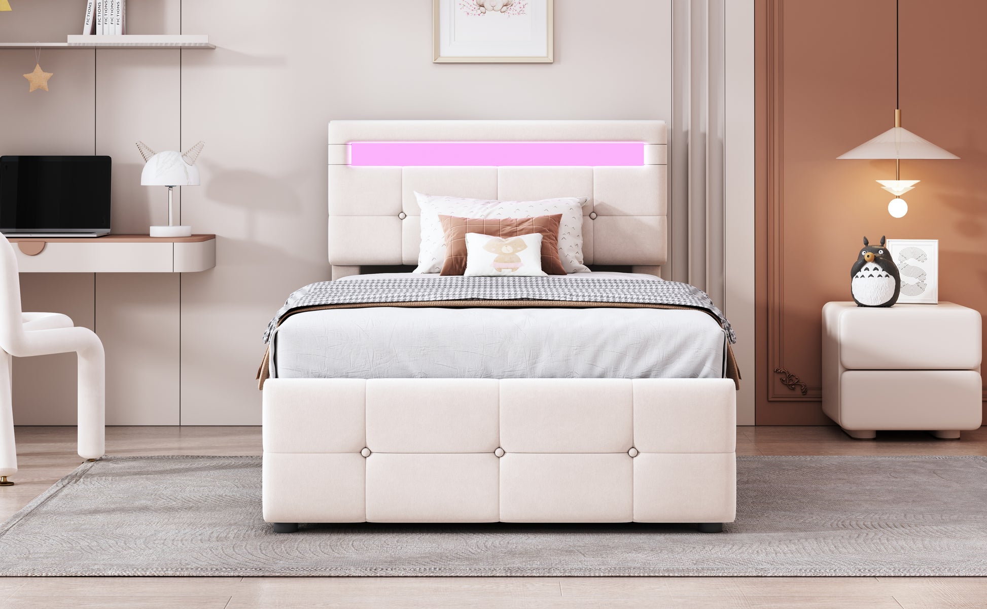 Upholstered Children's Bed 90x200cm, LED, Hydraulic Storage, Adjustable Headboard, Velvet Beige