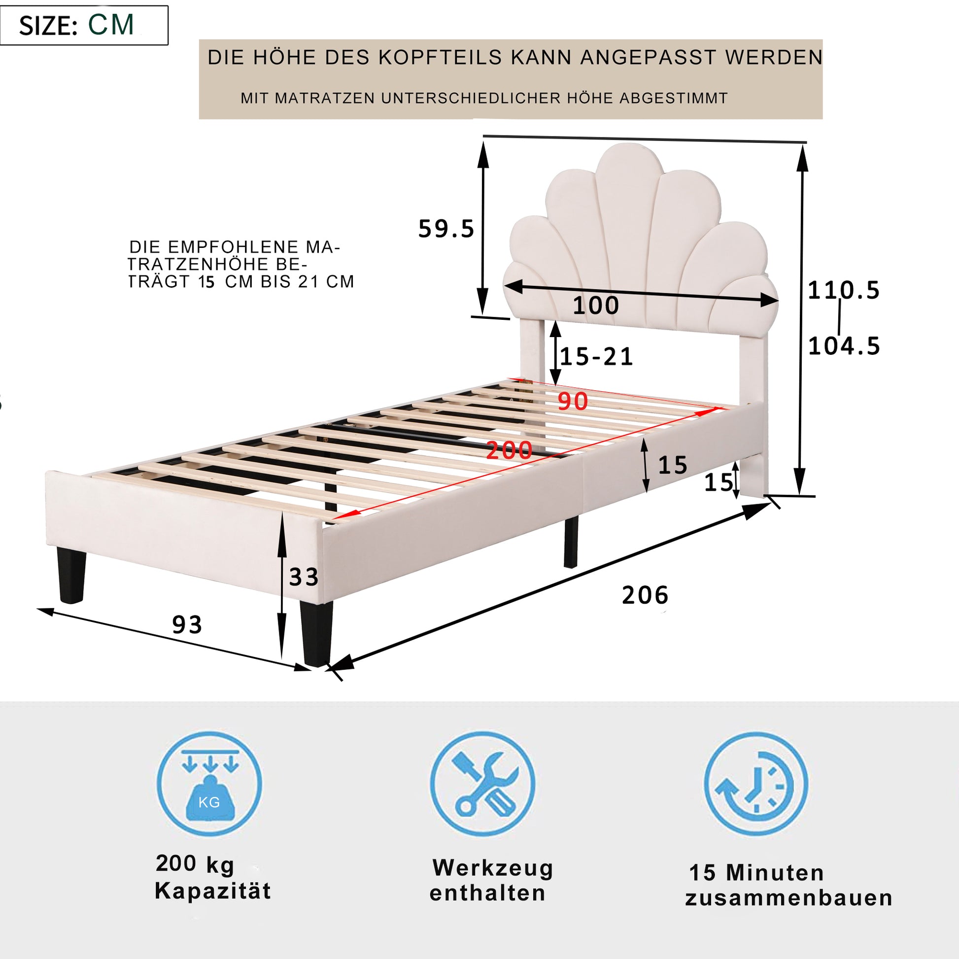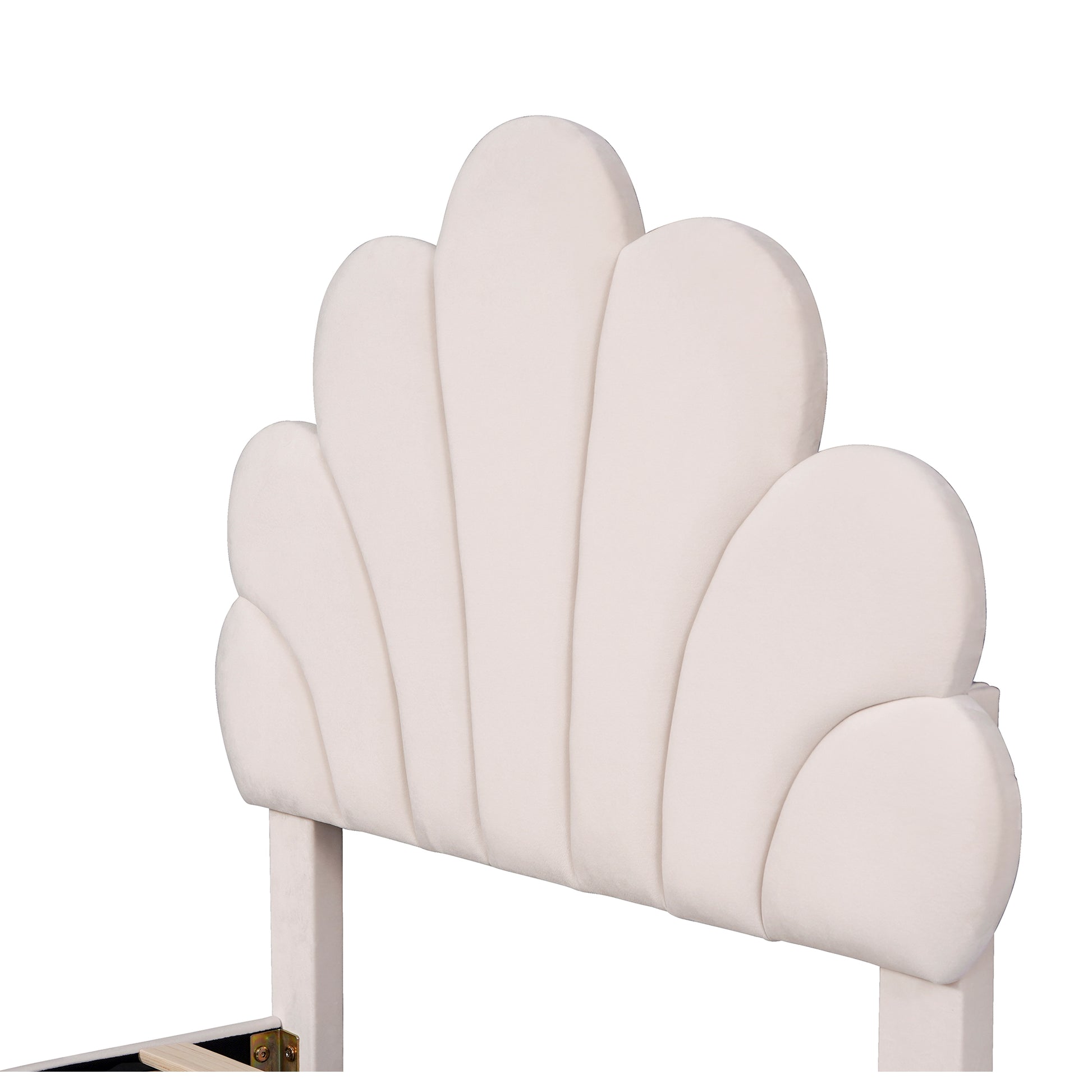 Upholstered Children's Bed with Flower Headboard and Slatted Frame, Velvet Fabric, Beige