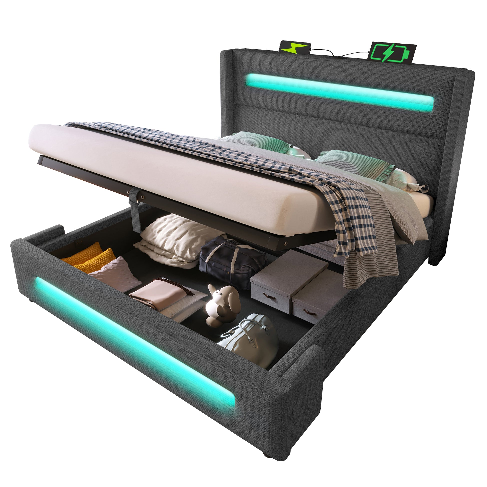 Upholstered Double Bed, 160x200 cm LED Storage with USB-C, Metal Frame, Gray Linen
