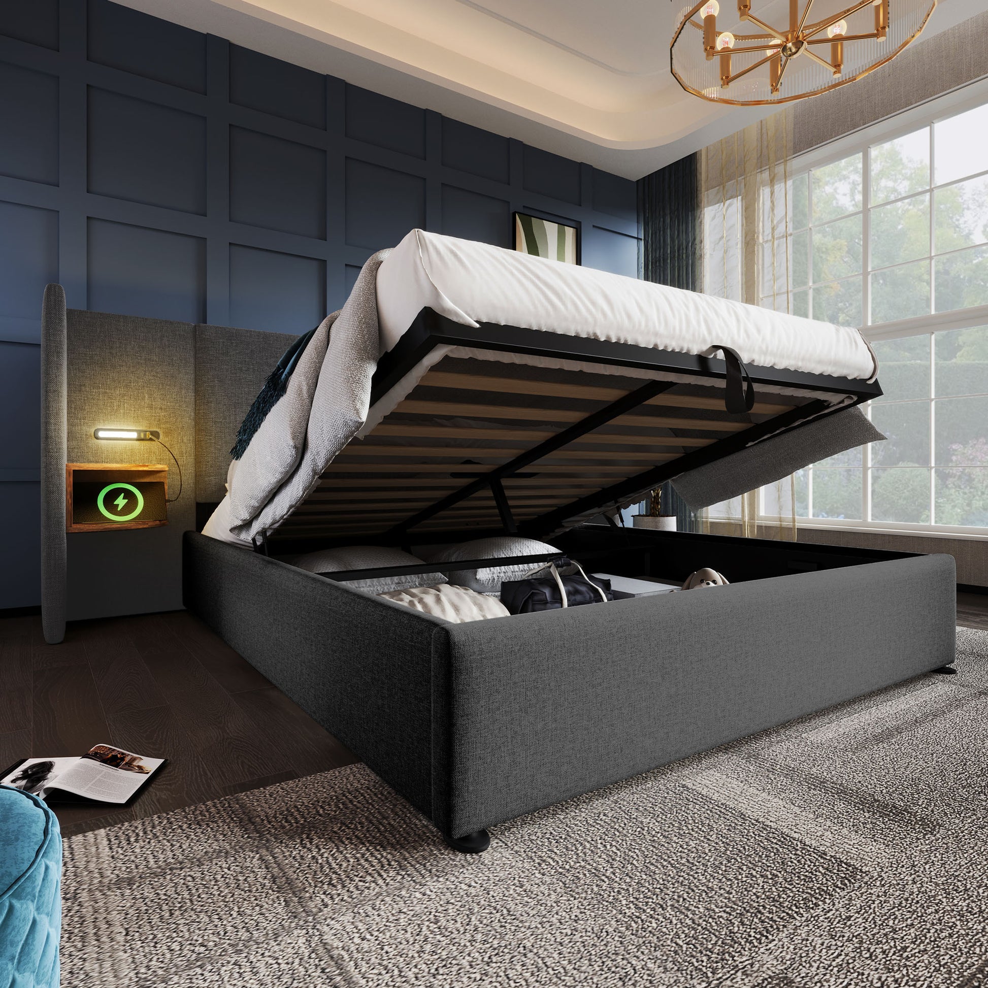 Upholstered Double Bed 160x200, with Bedside Table, Lamp, USB Type-C, Gray Linen