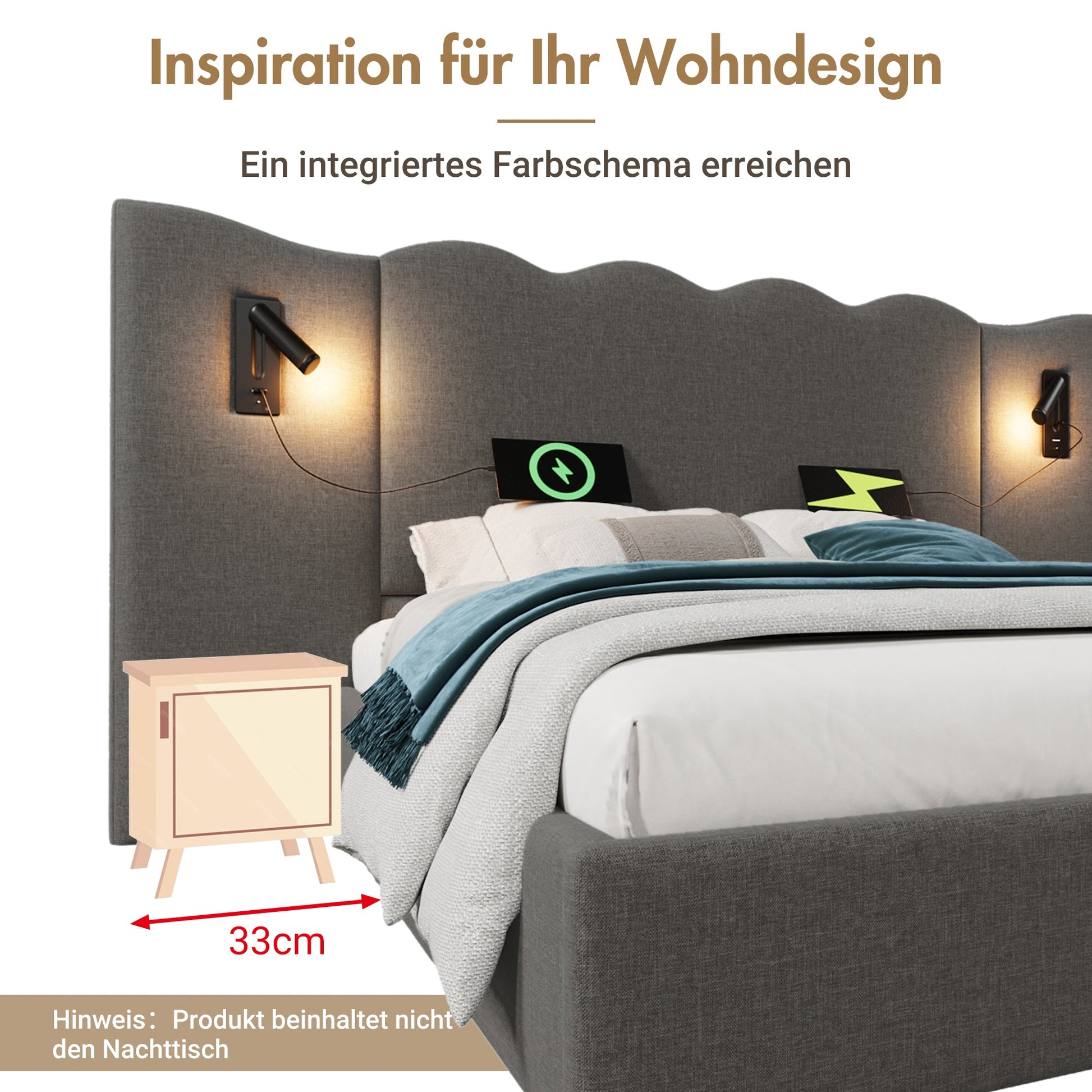 Upholstered Double Bed 180x200 with Reading Lamp and USB Type-C, Storage Bed Frame, Grey Linen