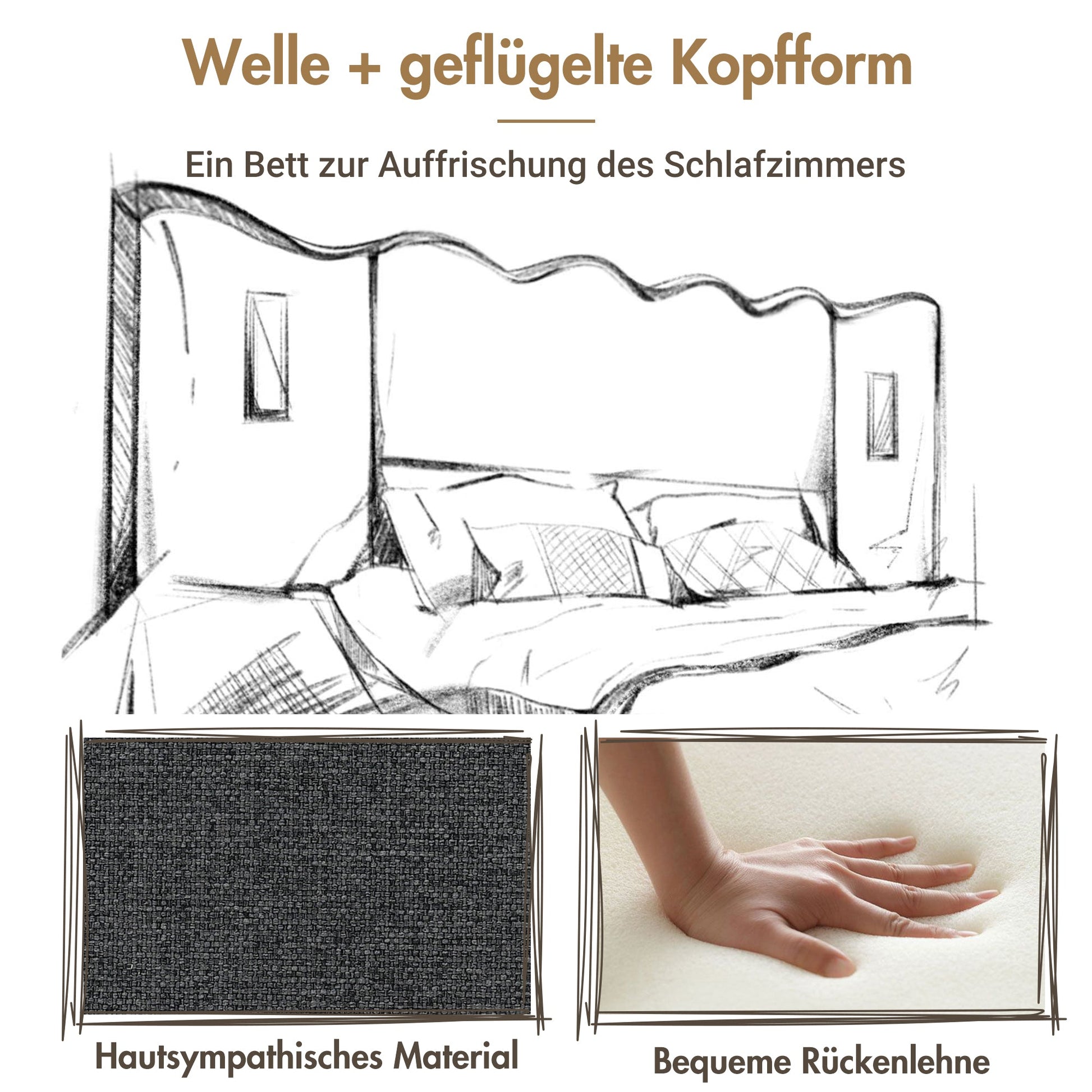 Experience modern comfort and functional design with this 180×200 cm upholstered bed in elegant grey linen. The wave-patterned headboard adds a stylish touch to any bedroom, while the 360° rotatable reading lamp and USB/Type-C ports provide practical convenience right at your bedside. The hydraulic storage under the bed keeps blankets, pillows, and other items neatly organized, optimizing your living space. Built with a metal frame and solid wood slats, this bed offers long-lasting stability and a comfortable sleeping experience.