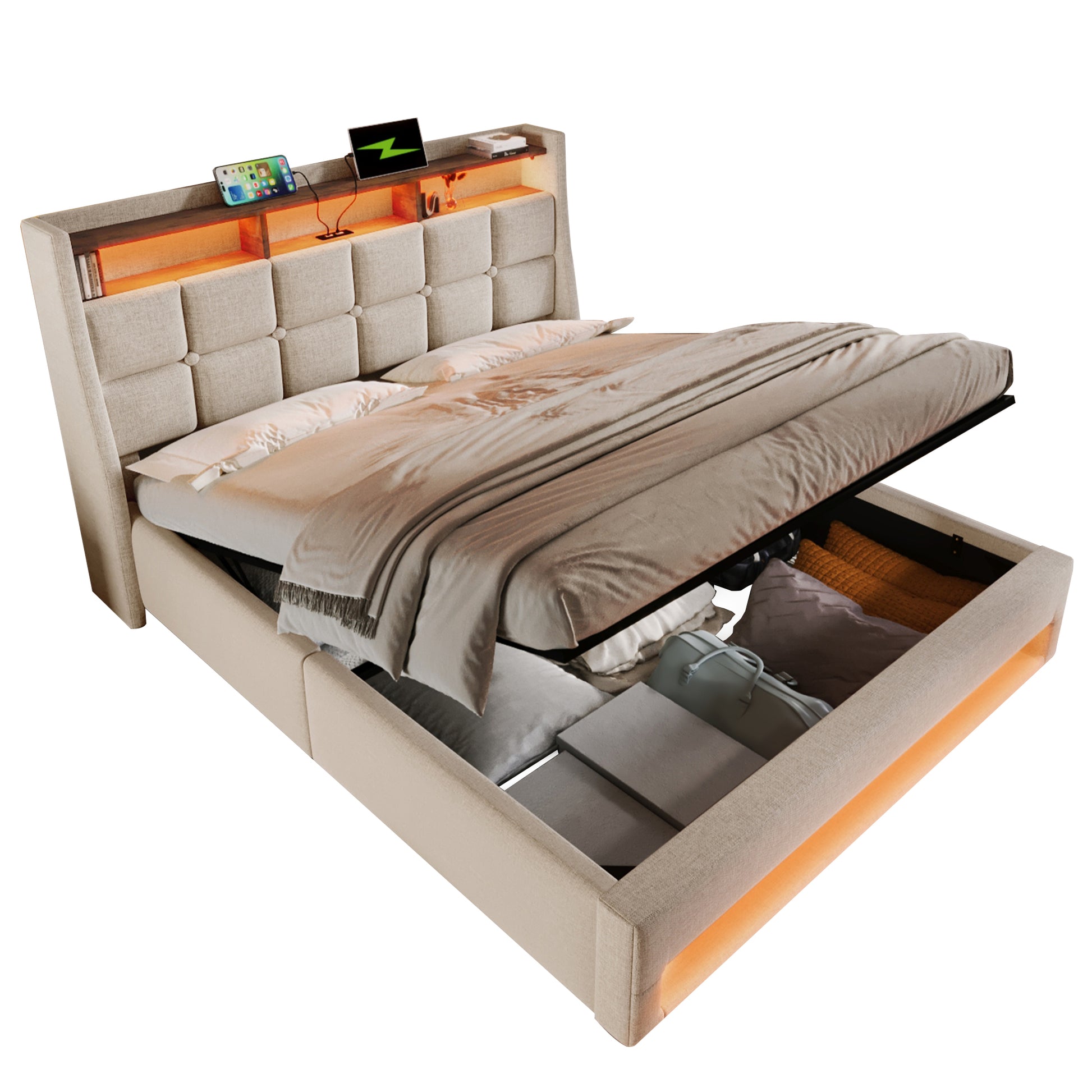Upholstered Double Bed 4FT6 with LED Lighting, USB Type-C Charging, Storage Headboard, Beige Linen