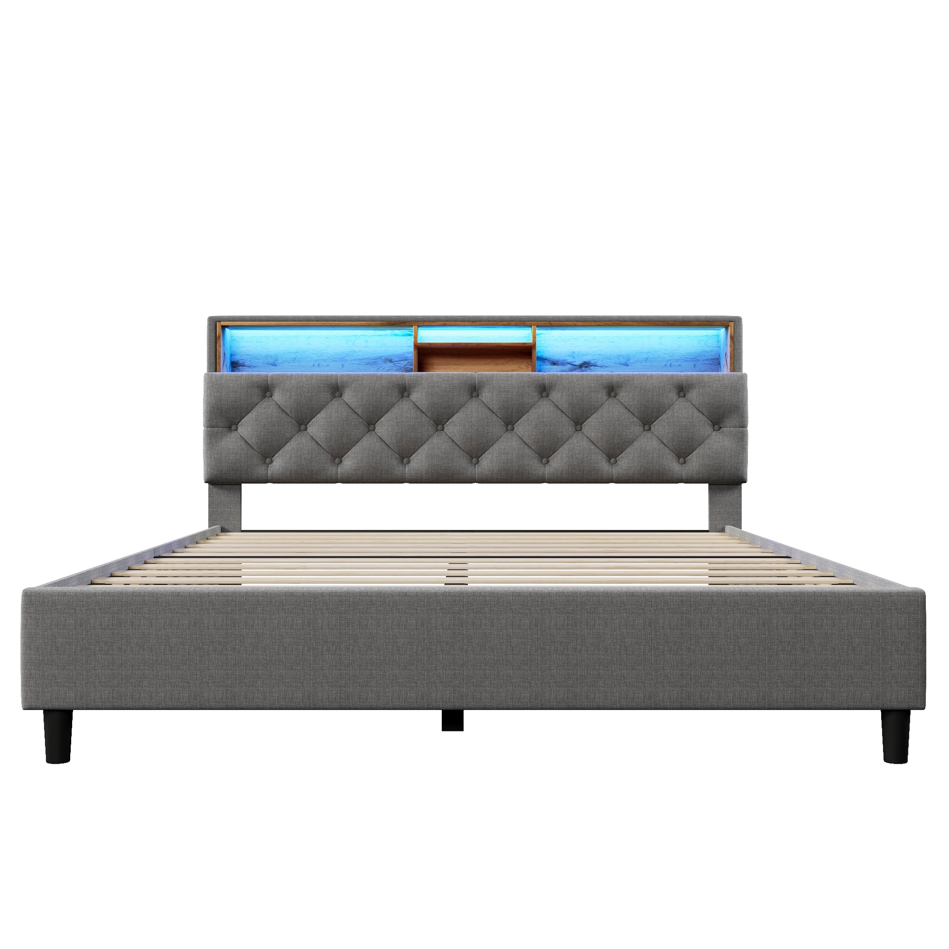 Upholstered Double Bed, Storage Headboard LED Lighting Wooden Frame 140x200cm, Grey