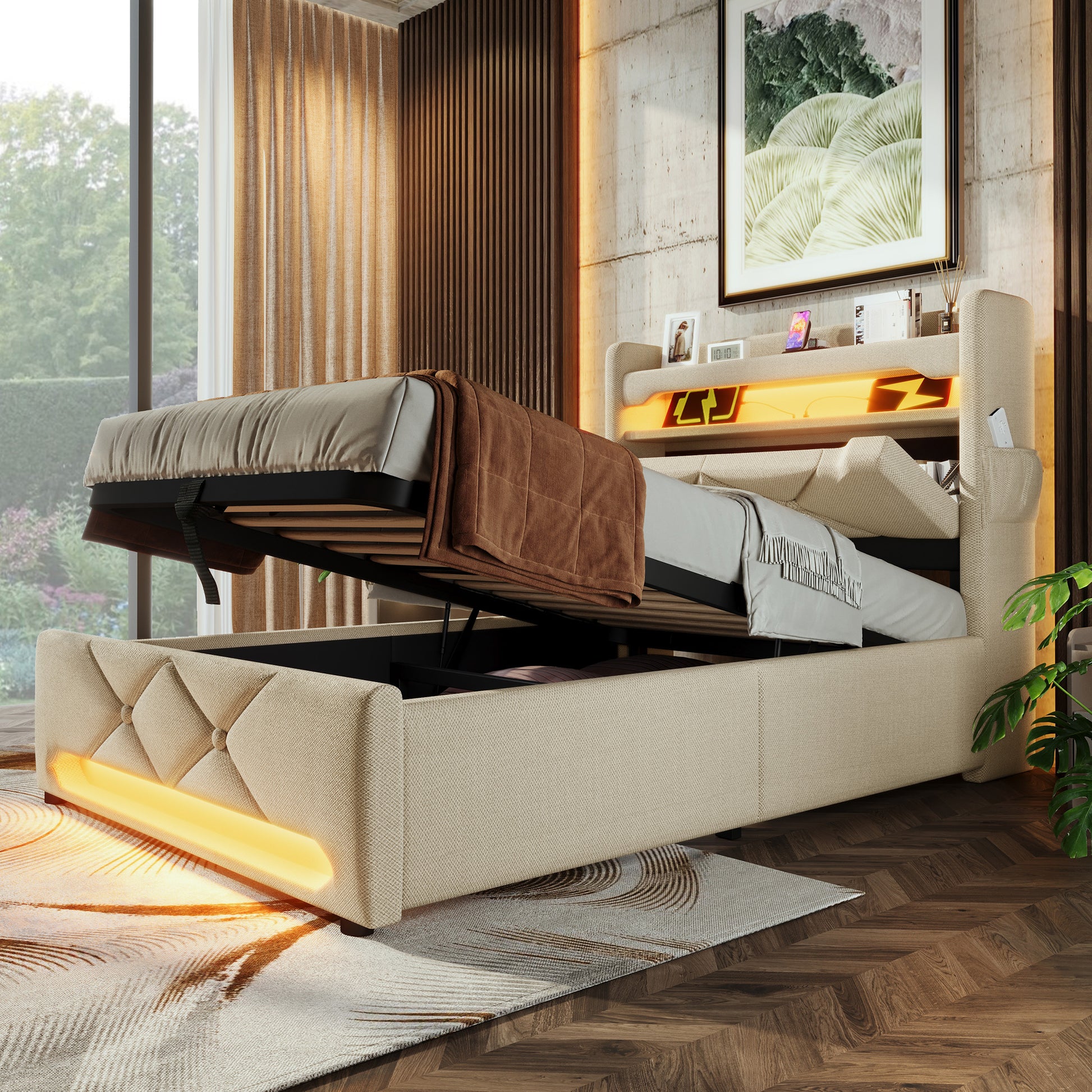 Upholstered Single Bed 90x200 Hydraulic Storage LED/USB Headboard, Beige Linen