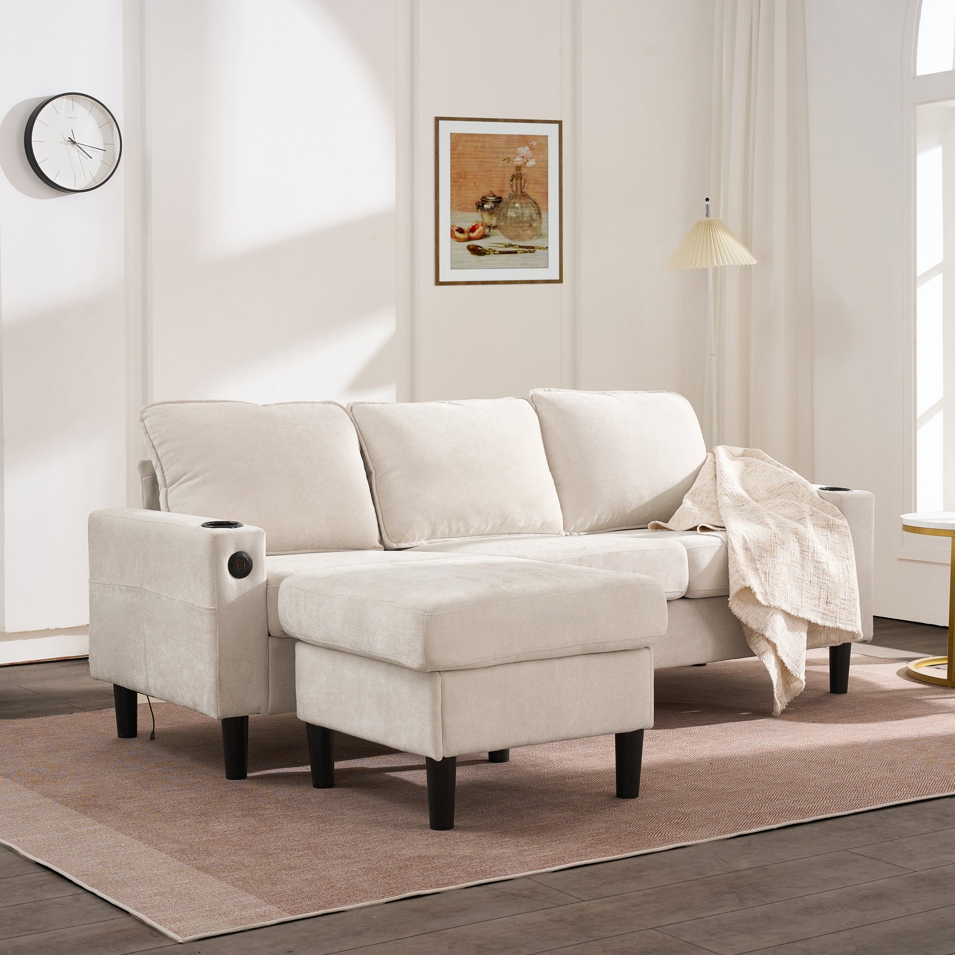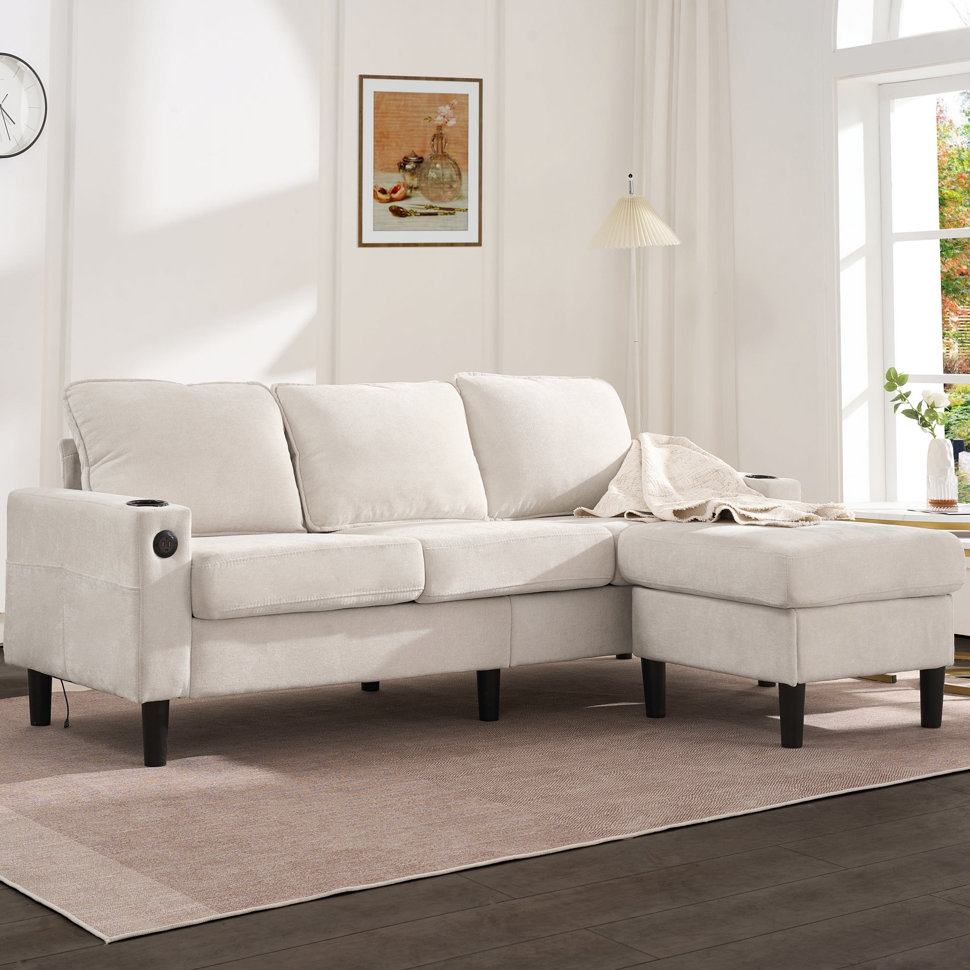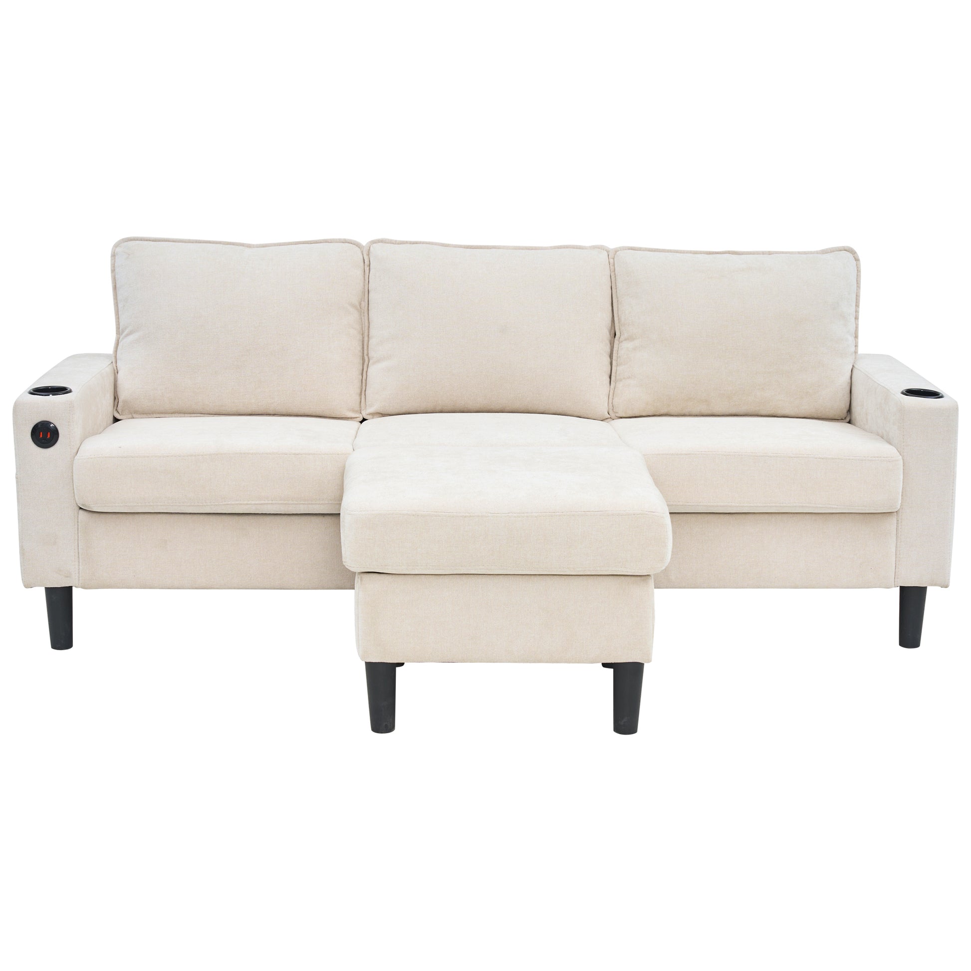 Upholstered Sofa, 3-Seater L-Shaped Sofa Bed with USB & Type-C Ports & Cup Holders, Beige