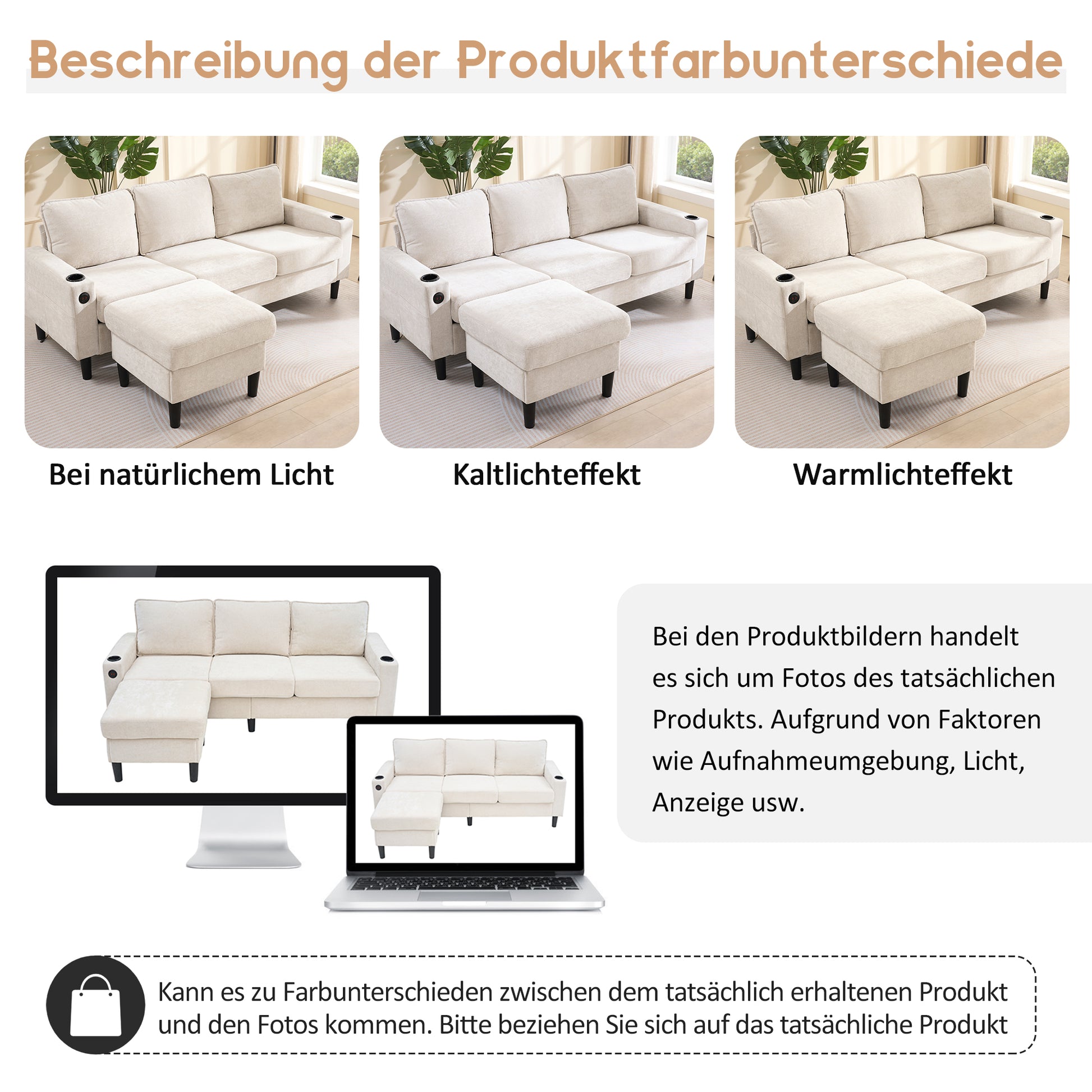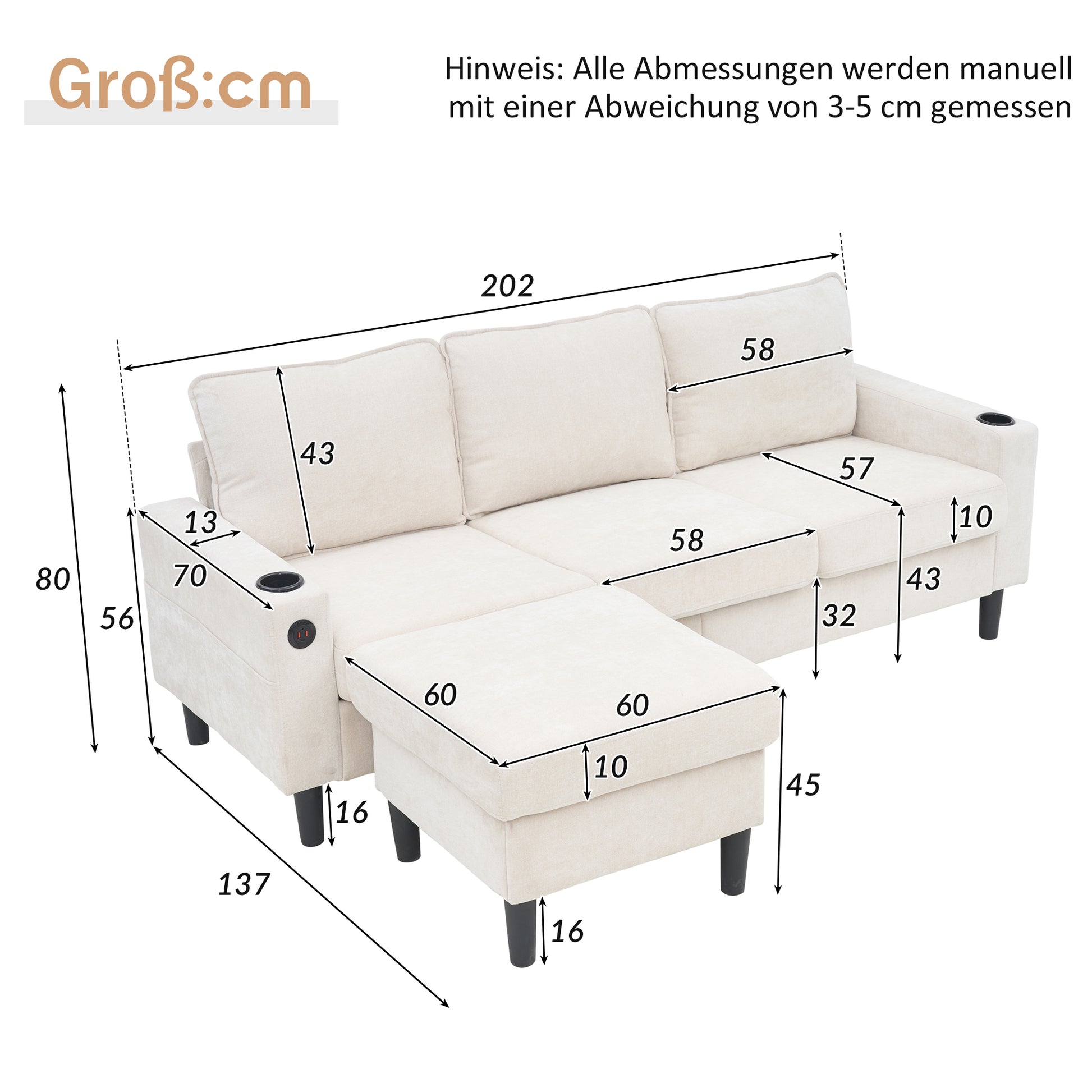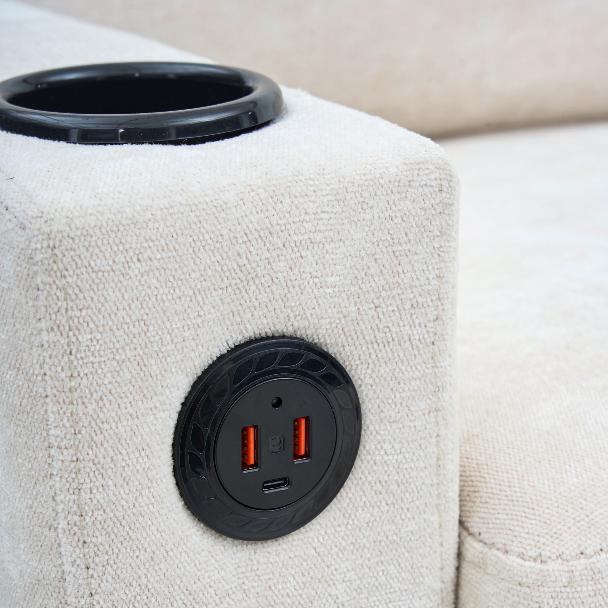 Upholstered Sofa, 3-Seater L-Shaped Sofa Bed with USB & Type-C Ports & Cup Holders, Beige