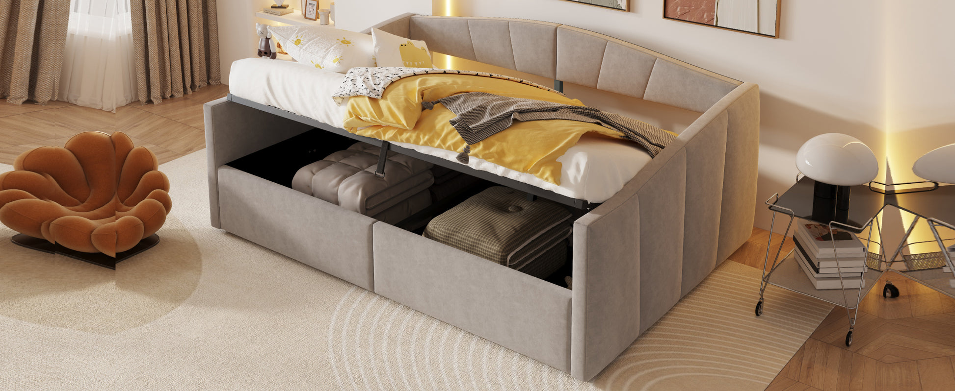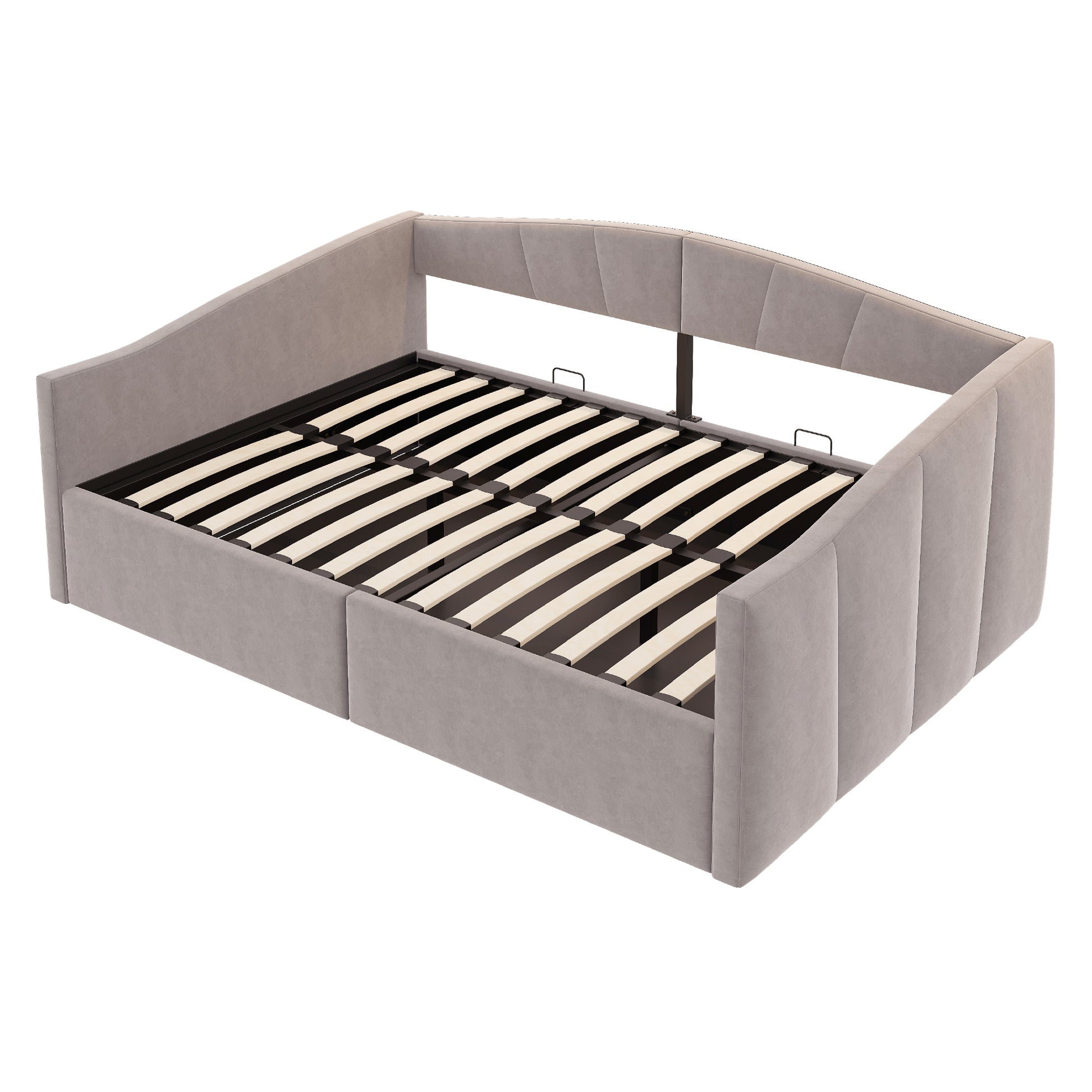 Upholstered Sofa Bed, 140x200cm Hydraulic Storage Slatted Frame Armrests, Light Grey Velvet