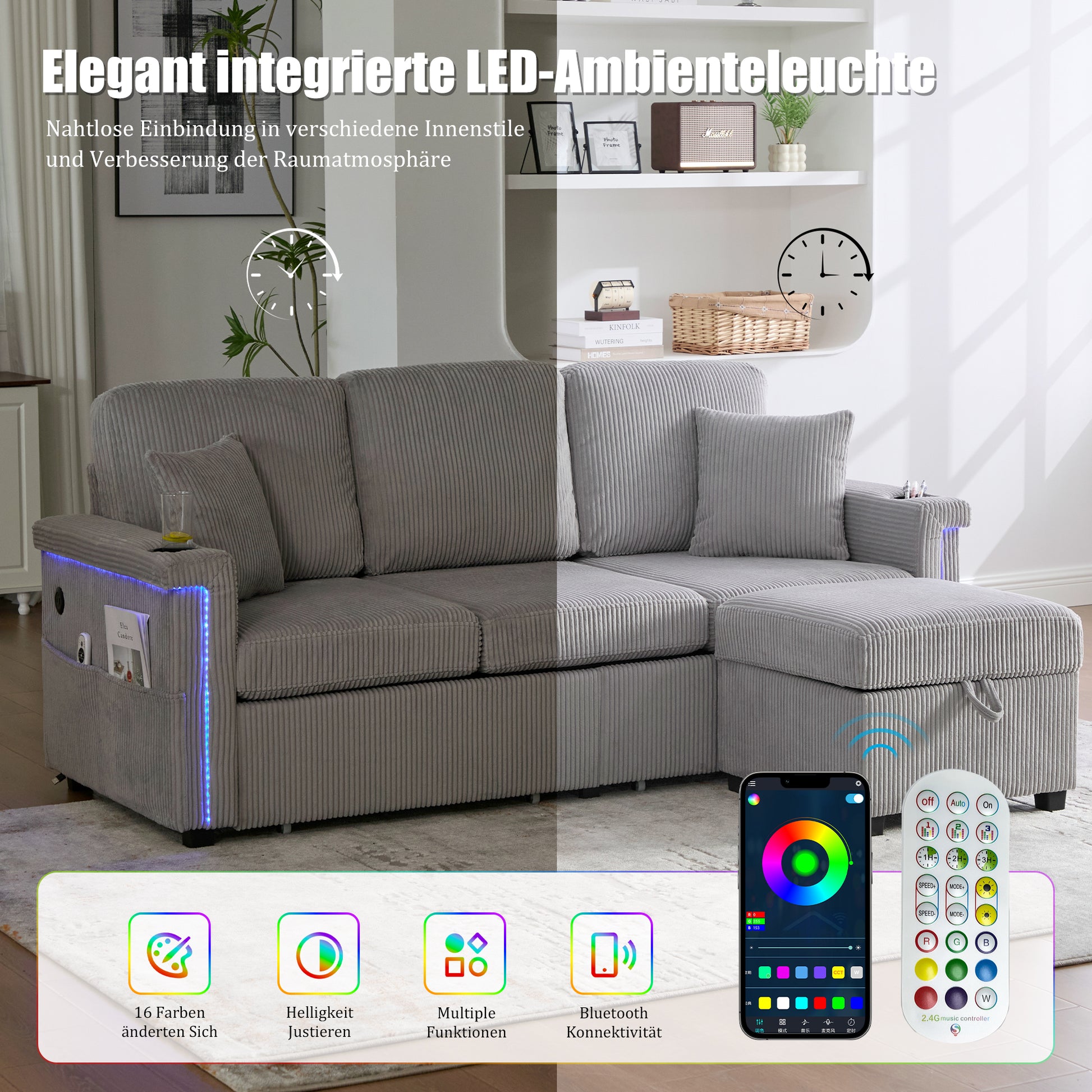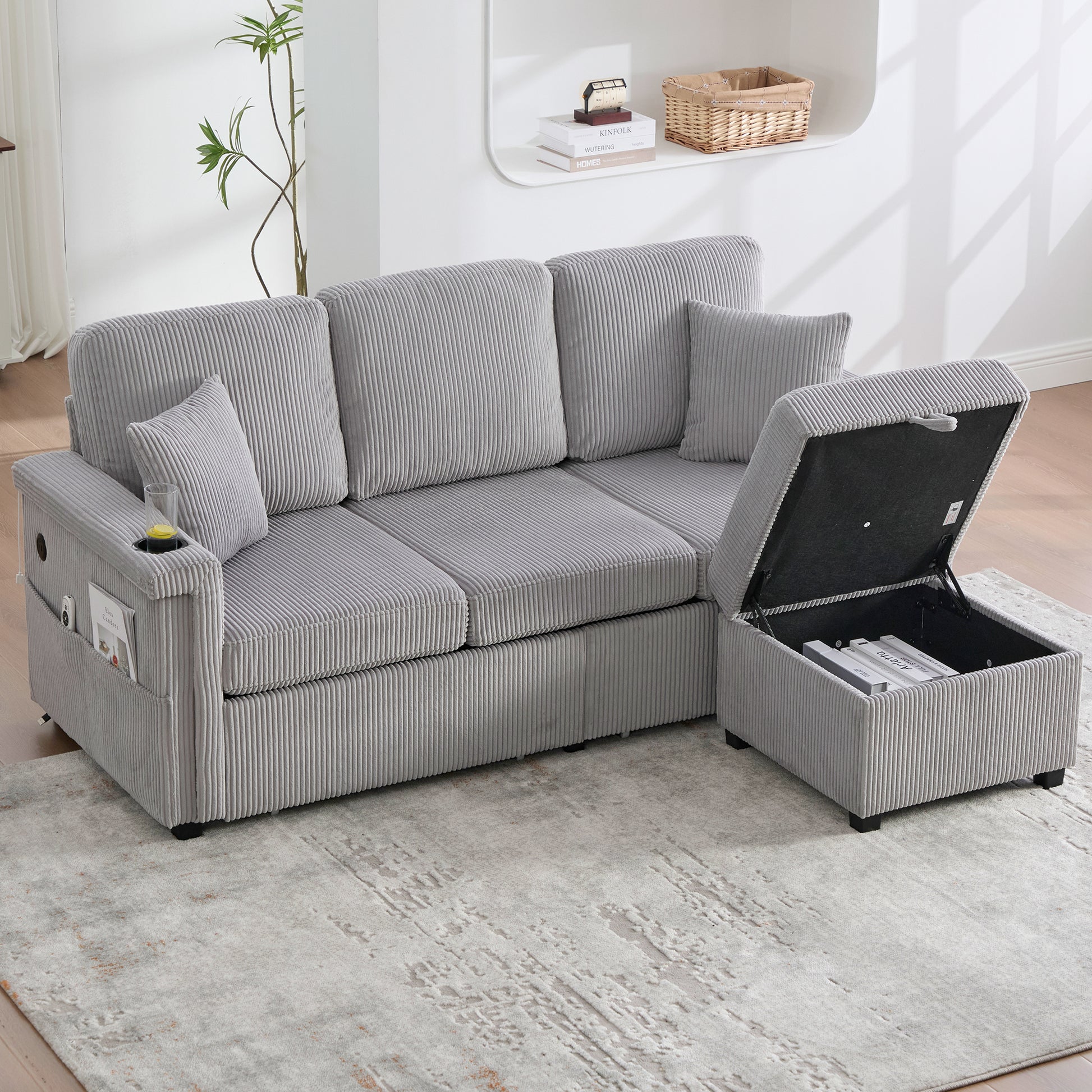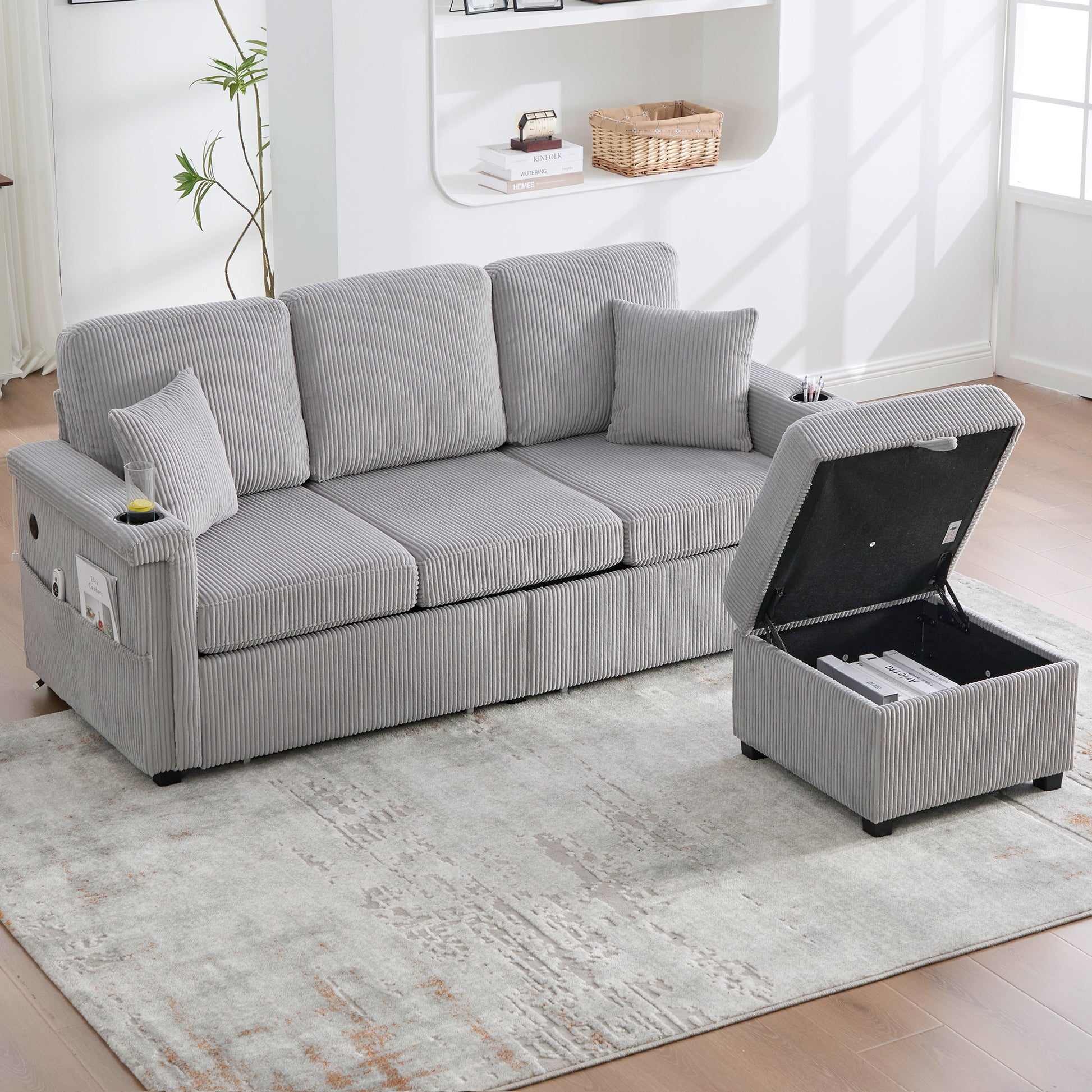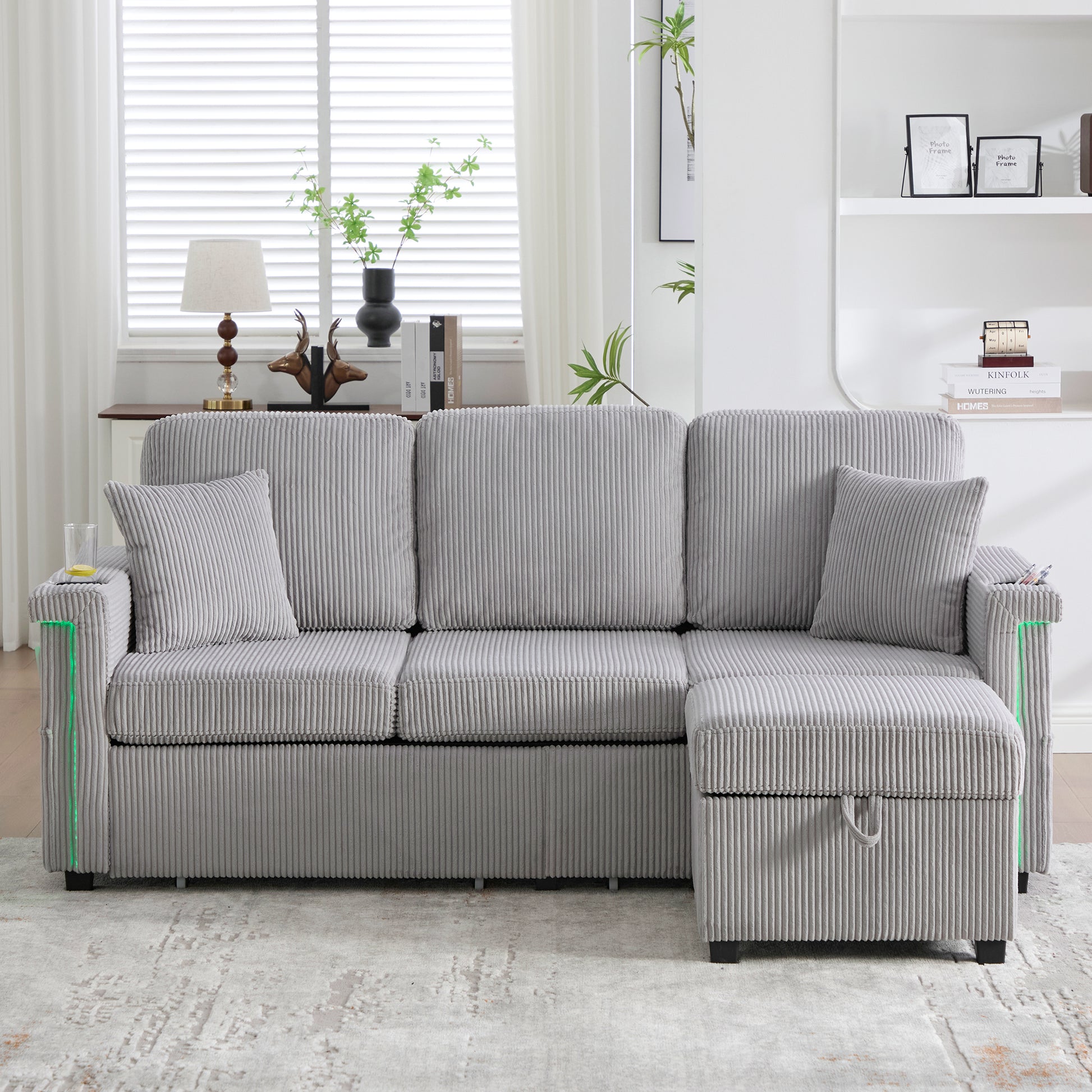 Velvet Sofa, LED, USB-C, Storage Ottoman, Cup Holders, Side Pockets - Light Gray