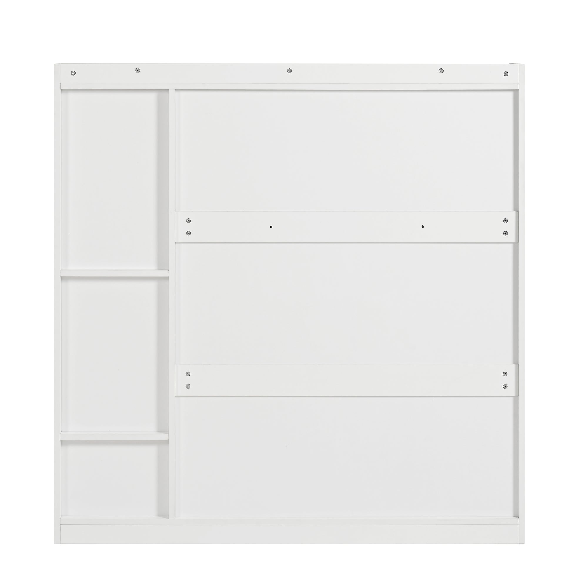 The cabinet features a fold-down bench that provides a comfortable place to put on and take off shoes.
