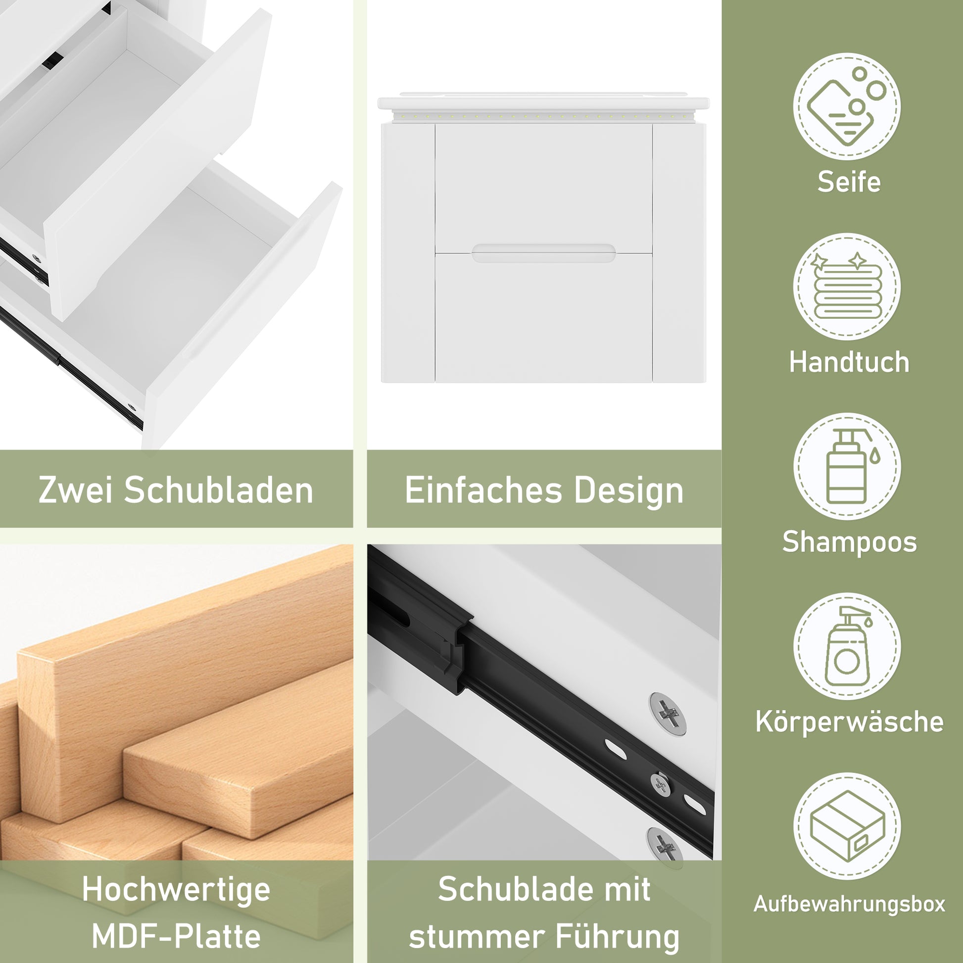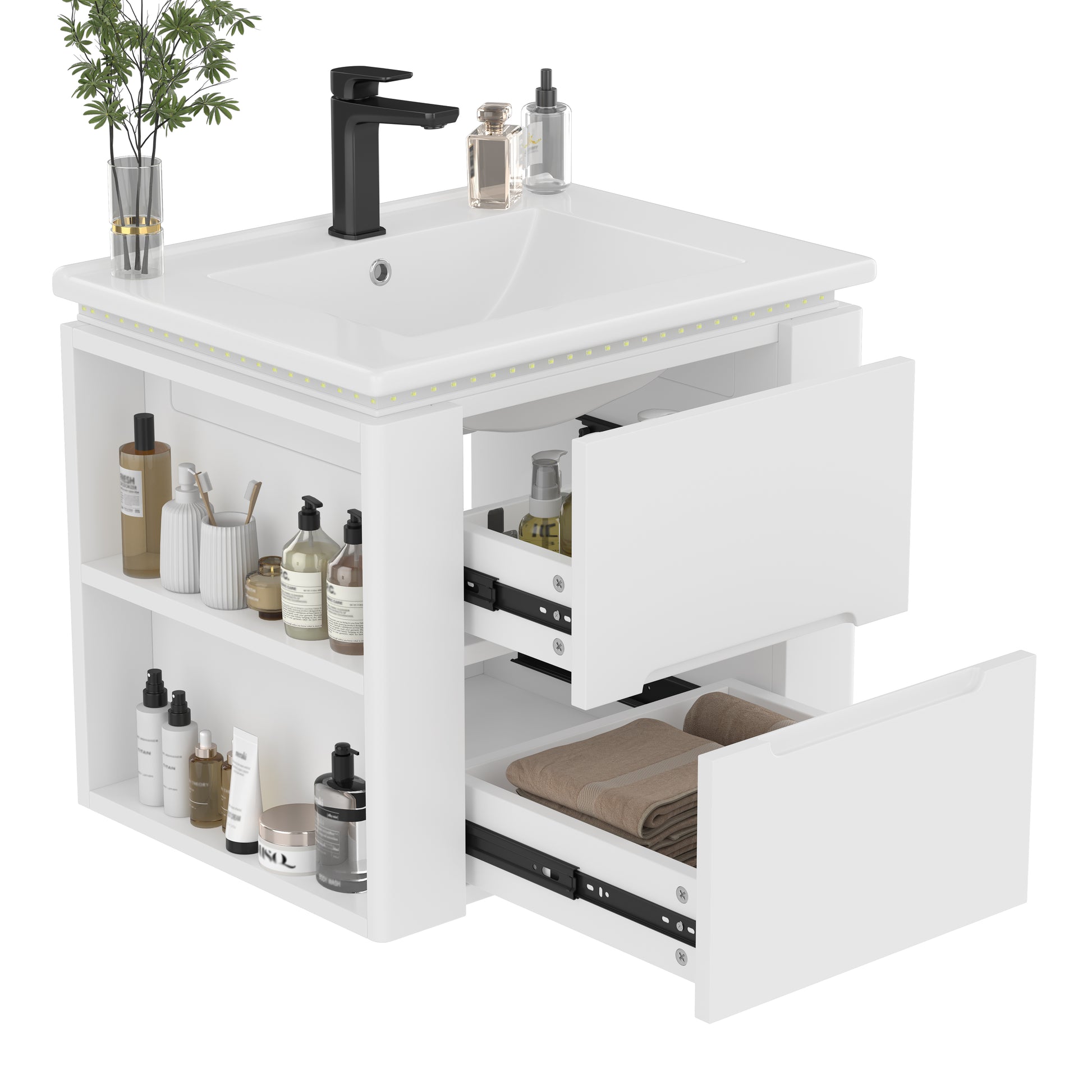 The cabinet excels in storage, helping to keep your bathroom neater and more organized. It features two drawers with silent runners that open and close smoothly and quietly, providing ample private storage space. Additionally, double open shelves on both sides can be used to organize and display various toiletries.