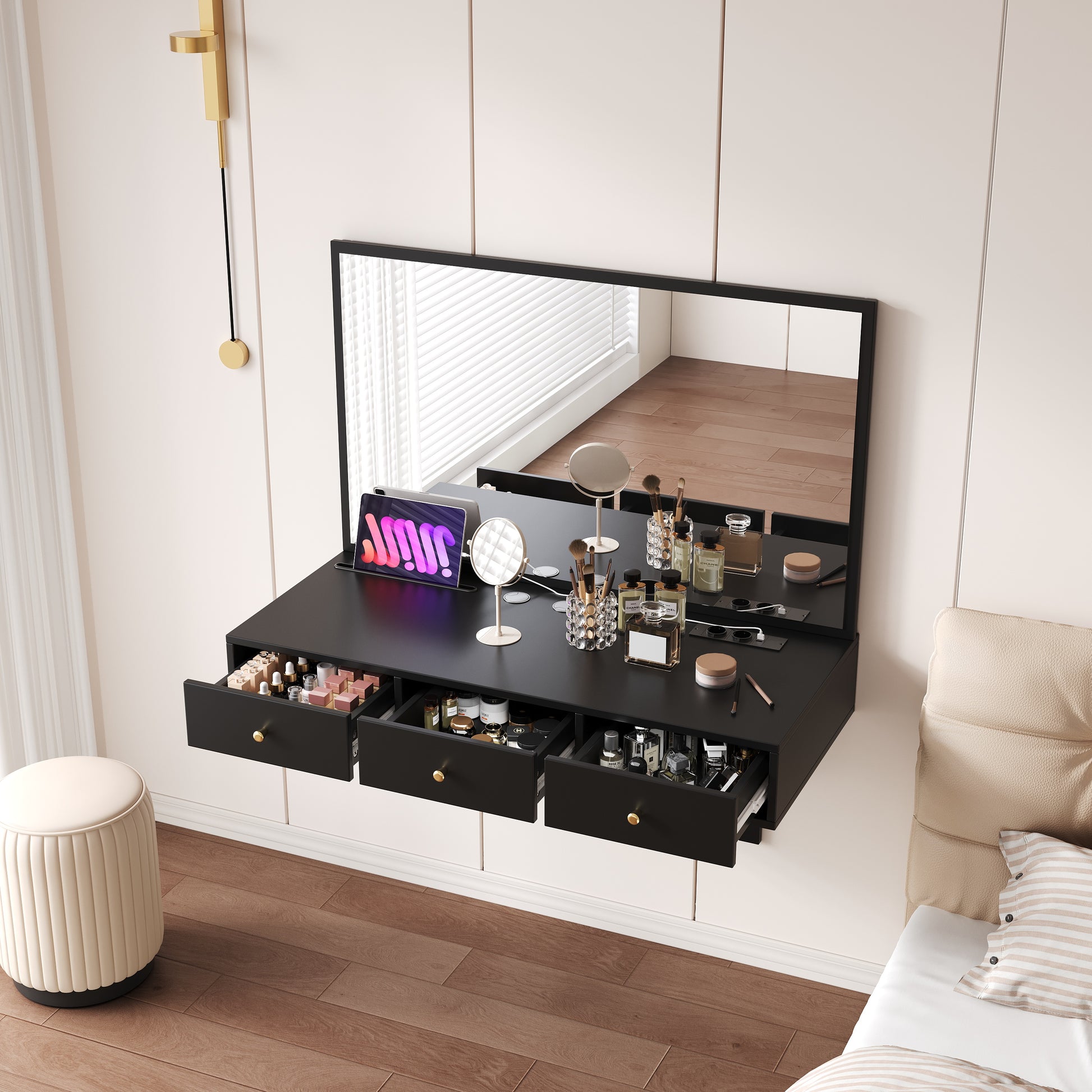 Wall-Mounted Vanity Table with Mirror, 3 Drawers, Power Outlets, Tablet/Card Slot, Drink Holder, Black