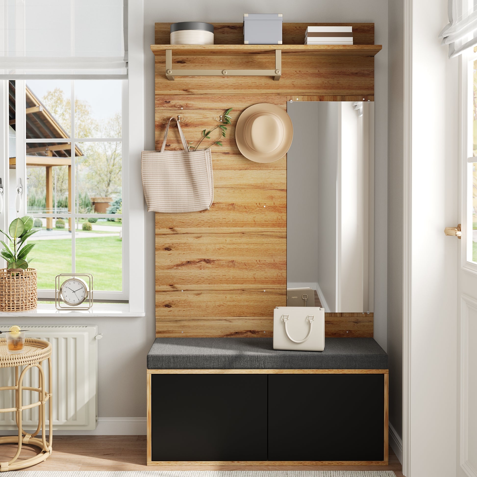 In addition to storage space, the flexible interior features a padded platform for easy access to shoes and open shelves for displaying decorative items or storing essentials. Convenient hooks are perfect for hanging coats, hats, or scarves, while the large mirror provides both brightness and functionality. Combining modern aesthetics with practical design, this hallway cabinet is a stylish and functional addition to any home.
