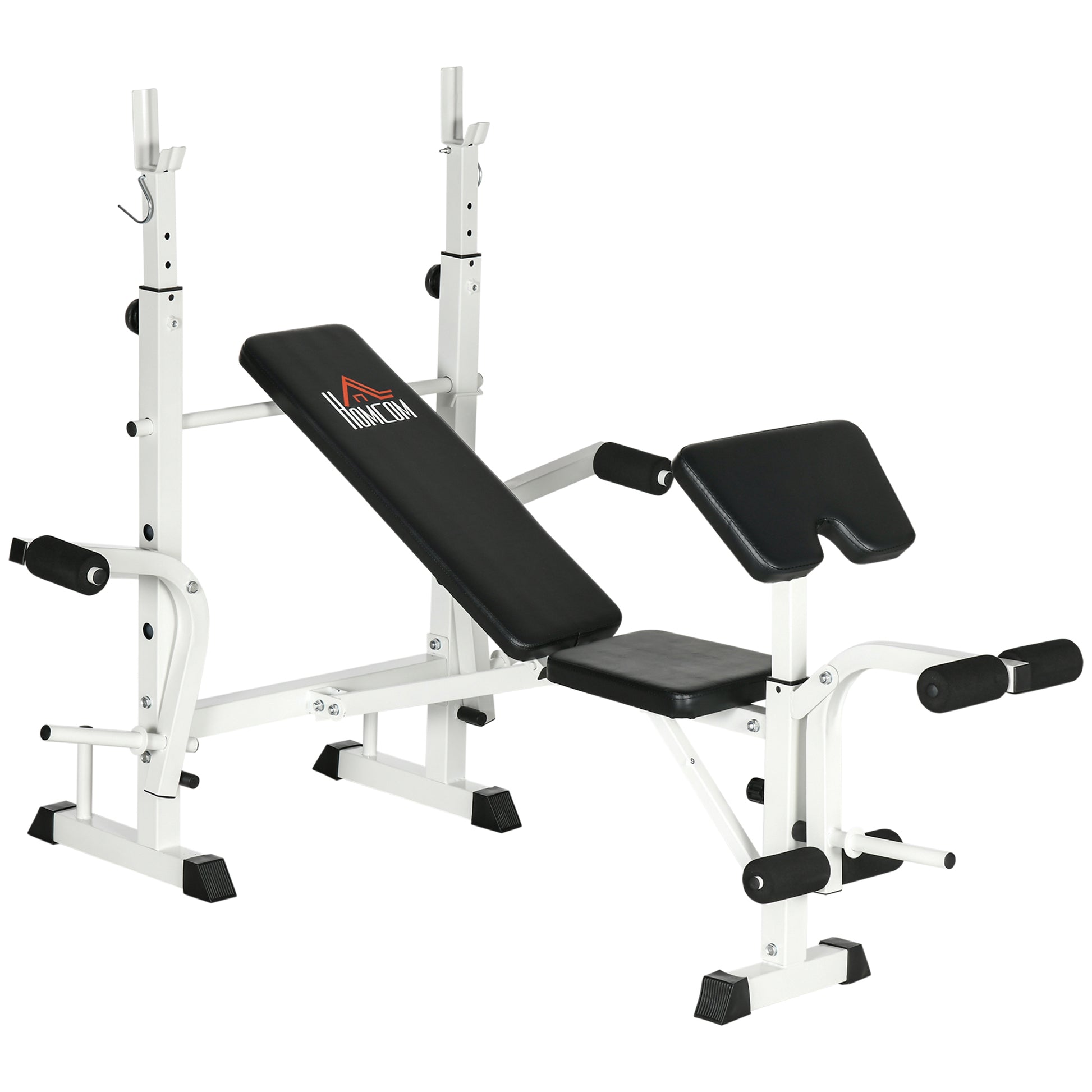 Weight Bench with Leg Press, Barbell Rack, and Armrests, Black and White