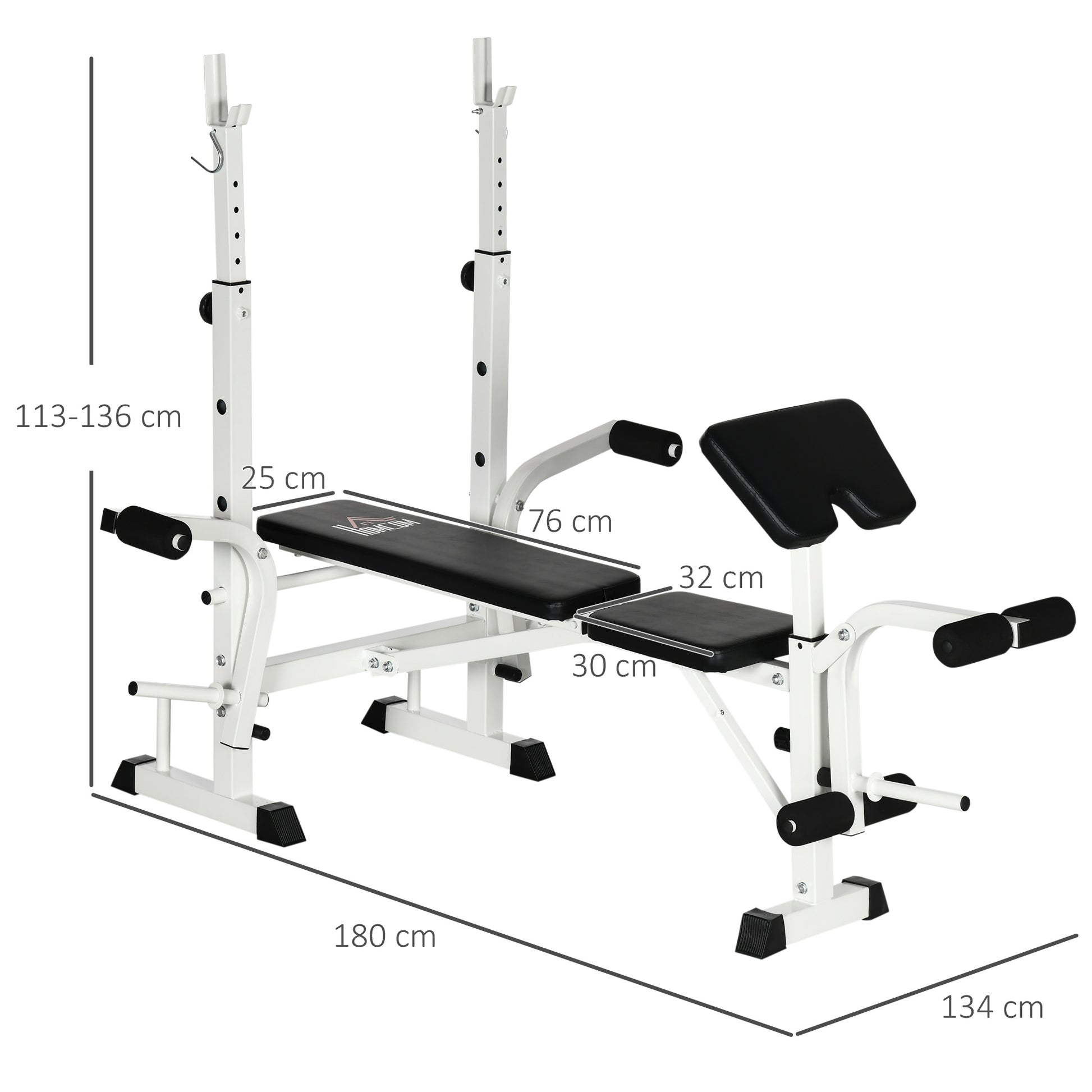180L x 134W x 113-136H cm. Load capacity: Bench: 150 kg, Barbell rack: 100 kg, Chest/Leg press: 25 kg. Assembly is required. Note: Weight plates and barbells are not included.