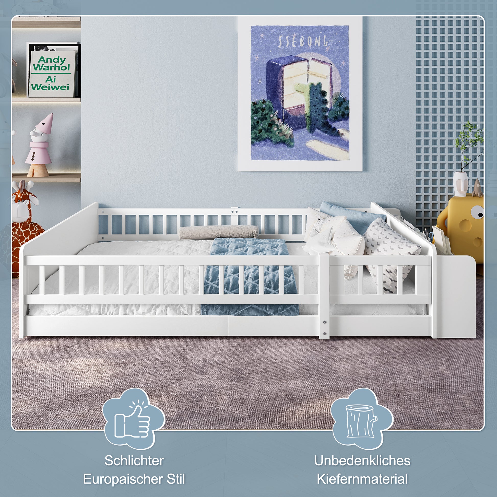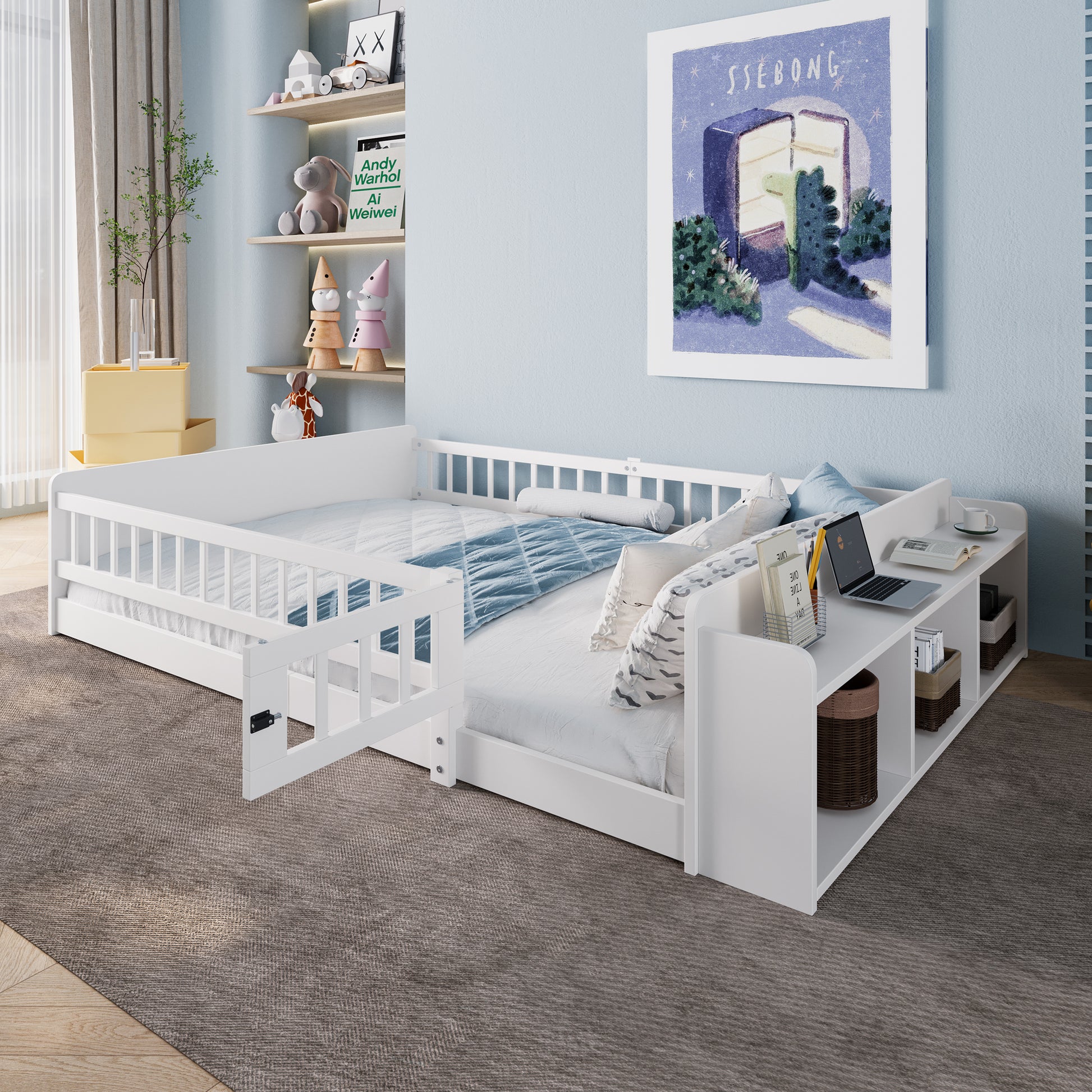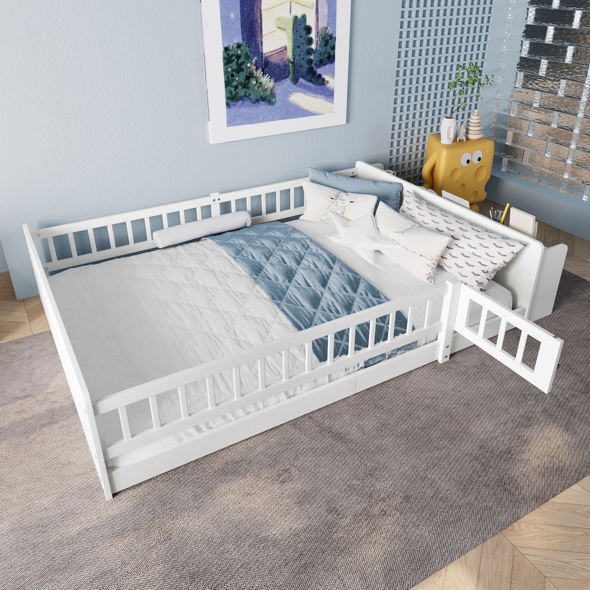 The design includes open storage, shelves, and an opening cabinet. Open cabinets and three-dimensional shelves combine to create ample storage space. Your child's beloved storybooks, creative puzzles, and plush toys can be neatly stored, helping the room stay clutter-free and subtly fostering a sense of organization. The gate opens and closes smoothly, serving as your child's exclusive "free passage." With a gentle push, your child can happily go through, while the safety gate gently watches over them—providing a sense of security and freedom. Featuring a modular splicing design, assembly steps are simple and clear. Give your child a happy and carefree childhood with this bed.