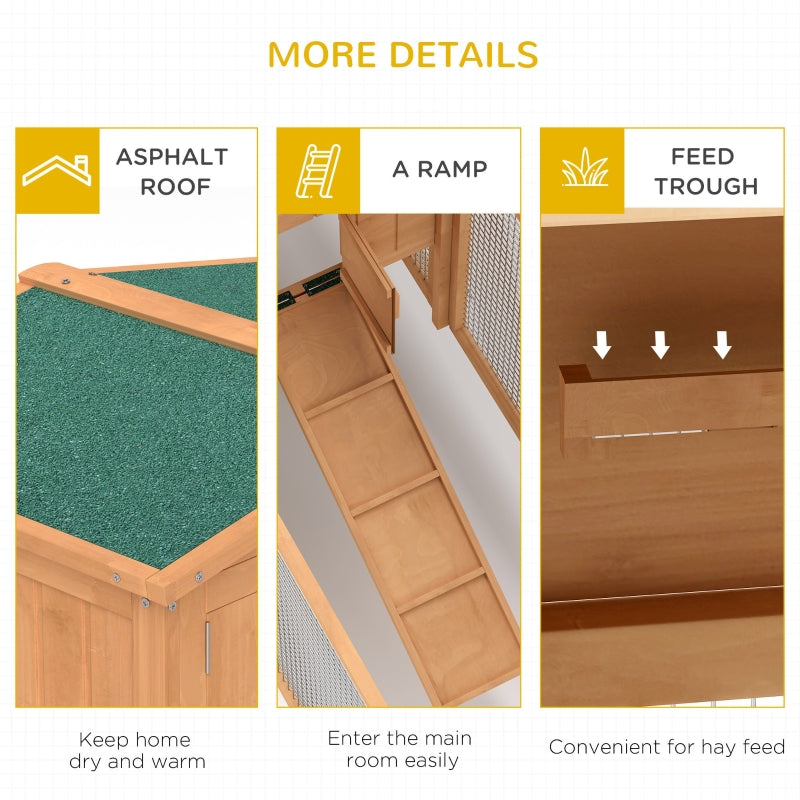STURDY: Constructed of natural fir wood frame, making it stable and durable. This outdoor rabbit hutch with run is coated with paint and a tilt waterproof roof is included against the weather elements.
