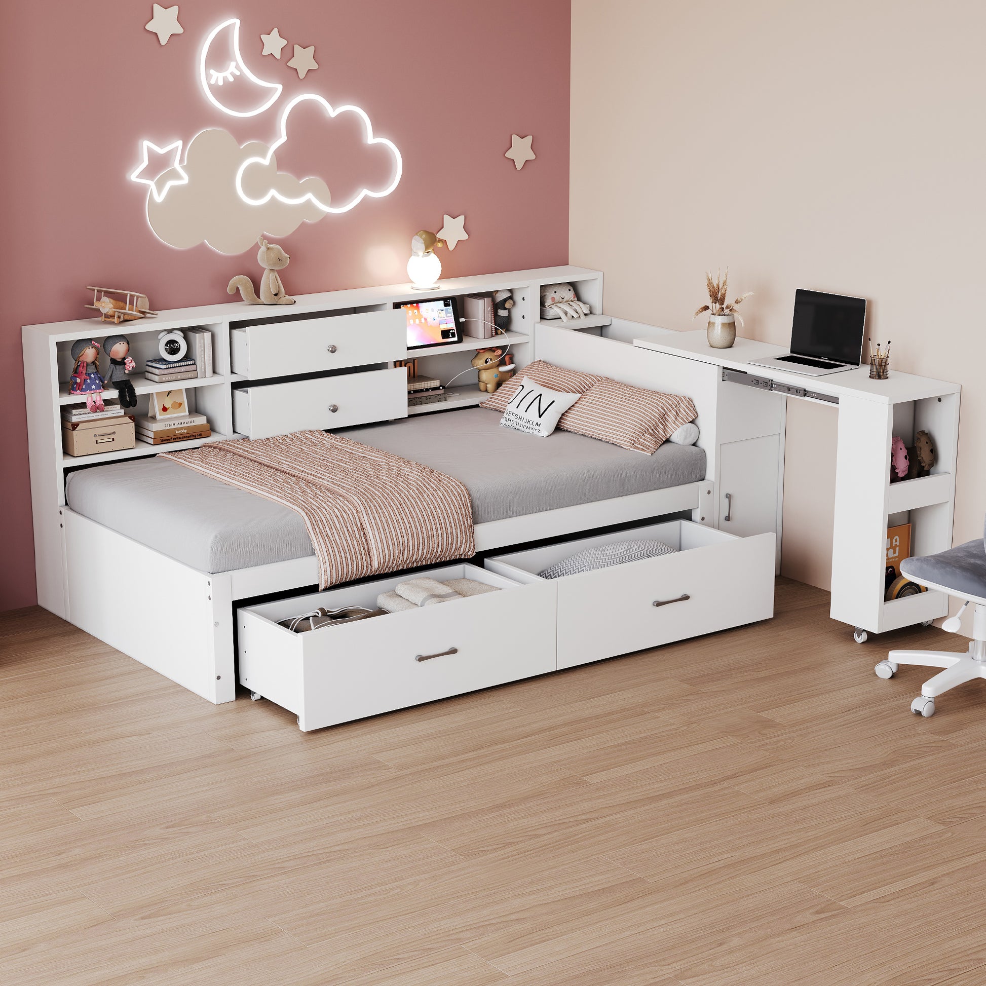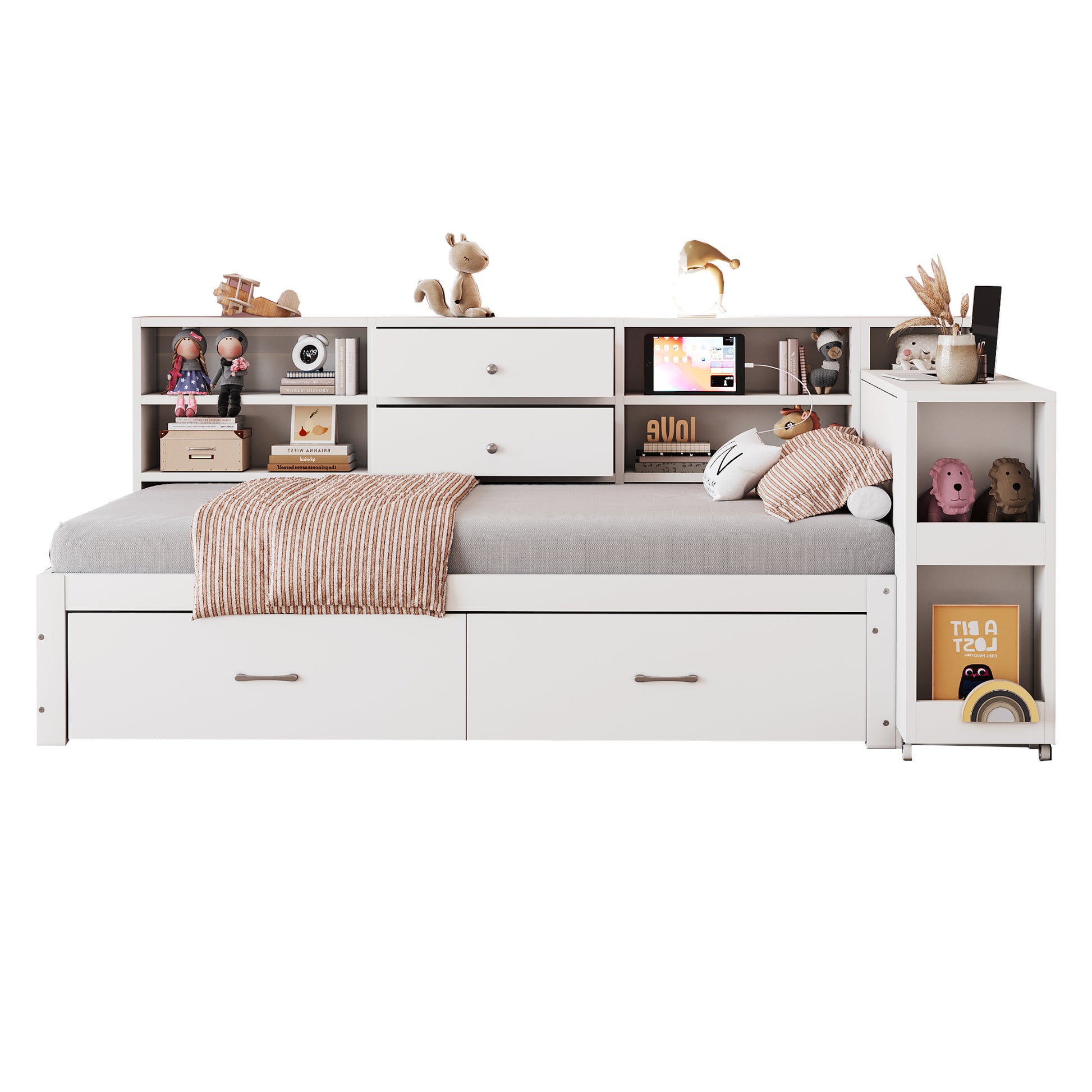 This single wooden bed is designed with ample storage, featuring multiple compartments and small drawers, complemented by two large drawers beneath the bed frame. The storage unit also includes a multifunctional interface with two USB ports and a round power outlet for quick and convenient device charging.