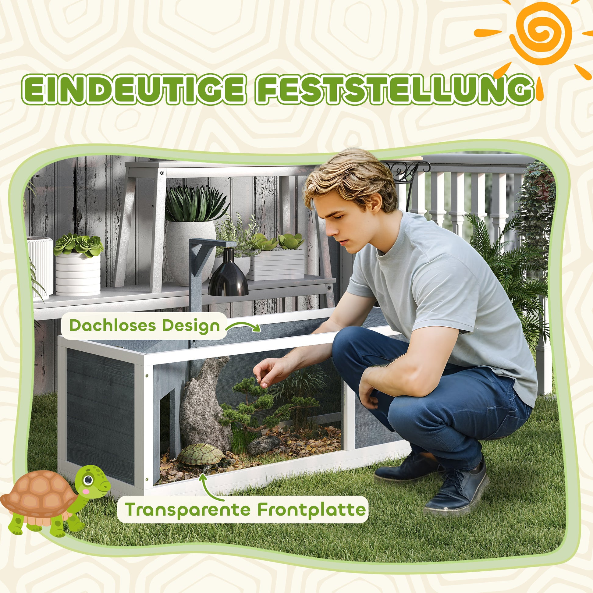 Wooden Turtle House, 2 Main Houses Hinged Top Light Stand Transparent Front Panel, Grey