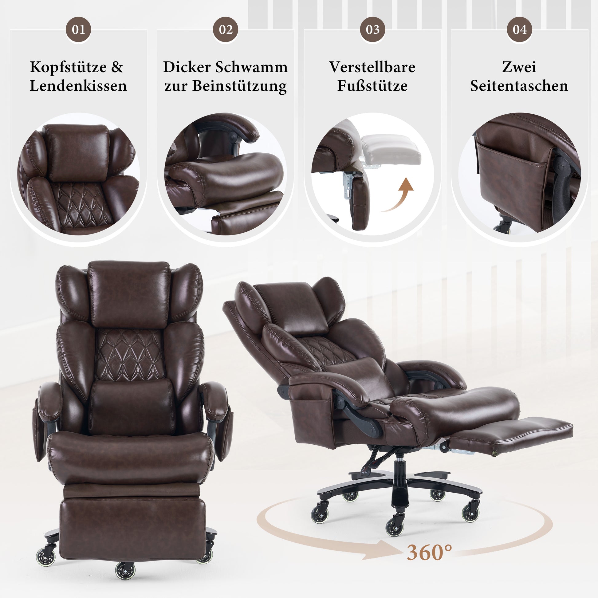 XXL Ergonomic Office Chair with Massage and Heating Function, Footrest and Adjustable Backrest, Brown PU Leather